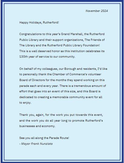 It’s time to kick off the holidays with a local tradition that is 72 years strong. The 72nd Annual Rutherford Chamber of Commerce Holiday Parade marks the beginning of the Rutherford holiday season. The Rutherford Chamber is proud to once again take the lead in bringing together the community and our local businesses for a day of celebration, appreciation, and good old-fashioned fun for all. The Rutherford business community is booming and together we grow stronger every year. Rutherford is truly the gem of southern Bergen County. Welcome to the 2024 Rutherford holiday season. Be merry, be bright, and be kind to all. Happy holidays Rutherford.