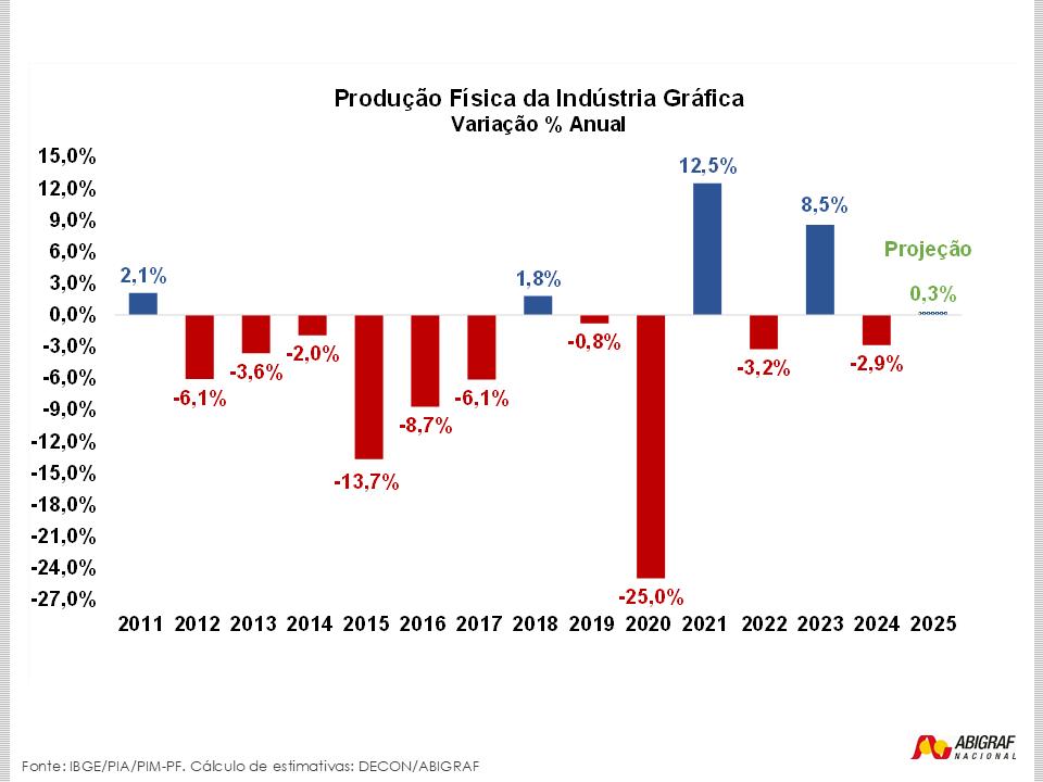 A produção física da indústria gráfica do primeiro semestre de 2025 recuou 4,3% na comparação com o mesmo período do ano passado. No ano, a projeção é de crescimento de 0,3%. O percentual é tímido, mas positivo em relação a redução de 2,9% registrada em 2024. Estes são alguns dados apresentados pelo gerente geral da Abigraf, Wagner Silva, na reunião com a ANDIPA.
