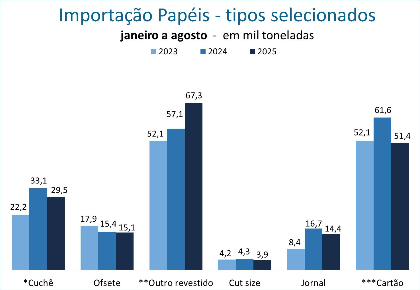 Já as importações dos papéis cortados (cut size), enquadrados nas NCMs 4802. 56 10 e 4802 56 99, têm os menores volumes na seleção pesquisada Conforme os dados oficiais, foram importadas 3,9 mil toneladas destes produtos nos oito primeiros meses deste ano. O volume é pequeno e representa redução na importação de cut size de 9,3% frente ao mesmo período de 2024 (4,3 mil toneladas) e de 7,1% quando comparado a 2023 (3,0 mil toneladas).