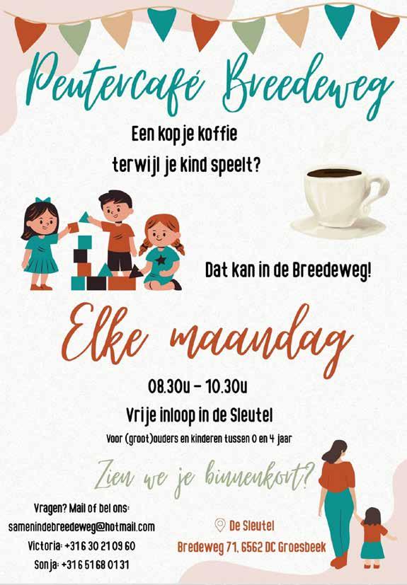 ‘Samen in de Breedeweg’ is ook breder actief. Zo zijn we per 1 september gestart met het peutercafé in de Sleutel. Het peutercafé is bedoeld voor ouders en ook opa’s en oma’s met kinderen tot vier jaar, om elkaar laagdrempelig te ontmoeten met een kopje koffie of thee, waarbij de kinderen lekker kunnen spelen.