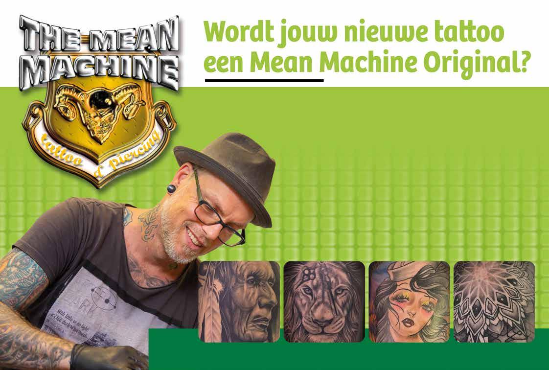 Voor zo’n tattoo ga je naar The Mean Machine in Groesbeek. Daar zetten ze tattoos en piercings, brengen permanente make-up (PMU) aan en kun je stoere kleding en accessoires kopen. Al sinds 1998 ben je hier bij Harry en Claudia Toonen in goede handen!