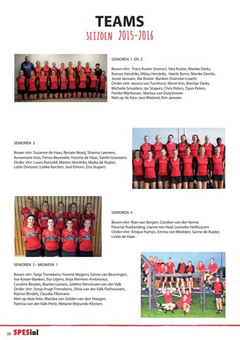 TEAMS SEIZOEN 2015-2016 SENIOREN 1 EN 2 Boven vlnr: Frans Kuster (trainer), Yara Koster, Nienke Derks, Romee Hendriks, Milou Hendriks, Veerle Berns, Nienke Dercks, Jessie Janssen, Ilse Koster -Banken (trainster/coach) Onder vlnr: Jessica van Turnhout, Merel Arts, Brechje Derks, Michelle Smulders, Ize Stupers, Chris Peters, Dyan Peters, Femke Wijnhoven, Marissa van Duijnhoven Niet op de foto: Jara Wieland, Kim Janssen