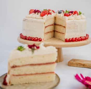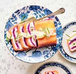 Verdeel de komkommerrolletjes in de lengte, liggend over de zuivelspread, zodat als je de terrine straks in plakjes snijdt, je mooie cirkels ziet. Vul de ruimte langs de randen van de schaal op met zuivelspread, verdeel nog een laagje over de bovenkant en strijk alles glad. Verdeel de rest van de biet erover en druk voorzichtig aan. Verdeel de rest van de zuivelspread erover, strijk glad en vouw de overhangende zalm erover.