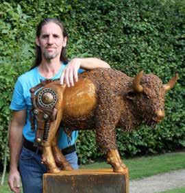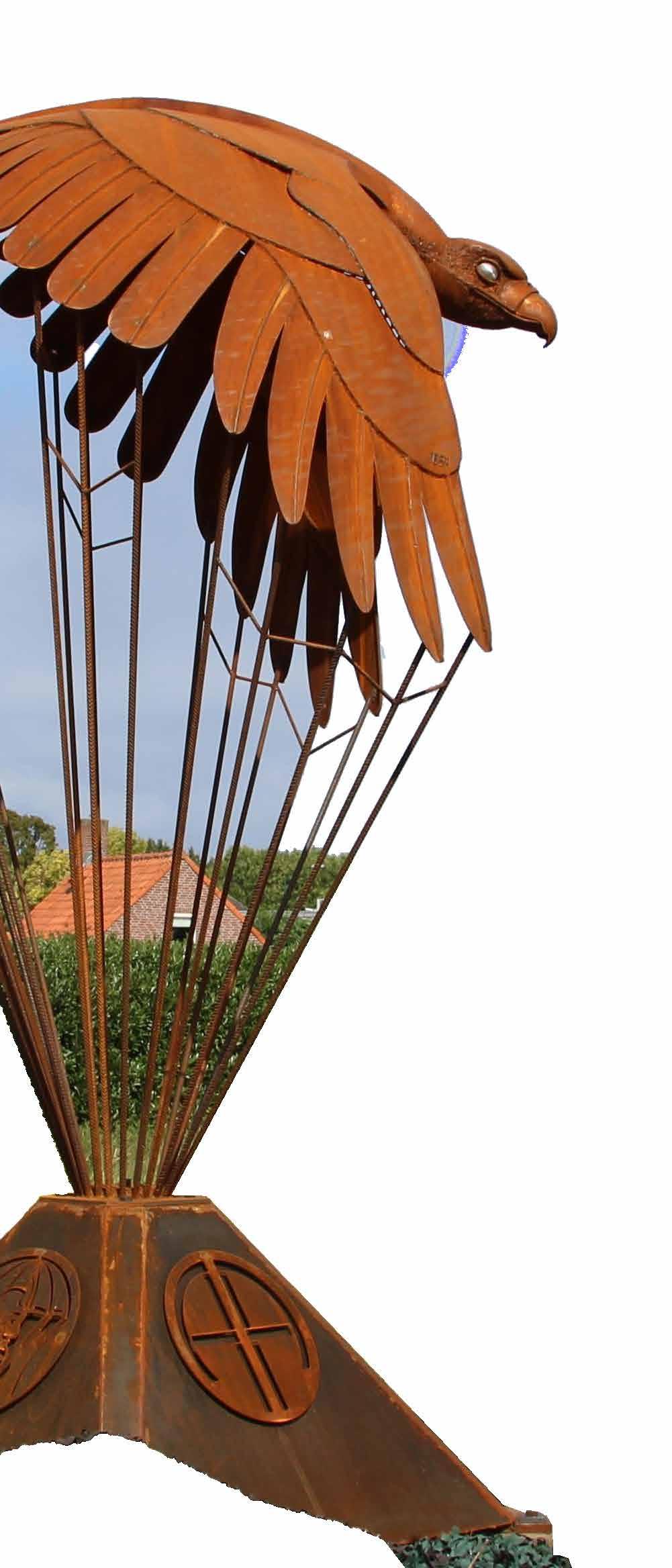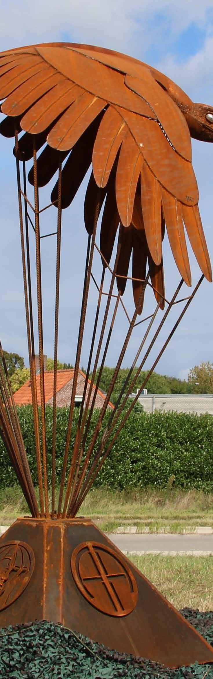 Uit CorTenstaal, een duurzaam, weerbestendig staal met een karakteristieke roestlaag, vervaardigt Joshua Pennings indrukwekkende sculpturen. Recent werkte hij intensief aan het kunstwerk dat nu de rotonde in Velp siert, als eerbetoon aan luitenant Hanford A. Files en alle Amerikaanse soldaten die in onze regio voor de vrijheid hebben gestreden.