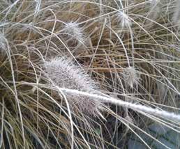 Siergrassen geven in de winter nog vorm aan de border, maar na de winter is het blad helemaal bruin en afgestorven. Onder het dode blad zitten voldoende groene grasstengels die in het voorjaar flink zullen uitgroeien. In maart mag je het siergras snoeien.