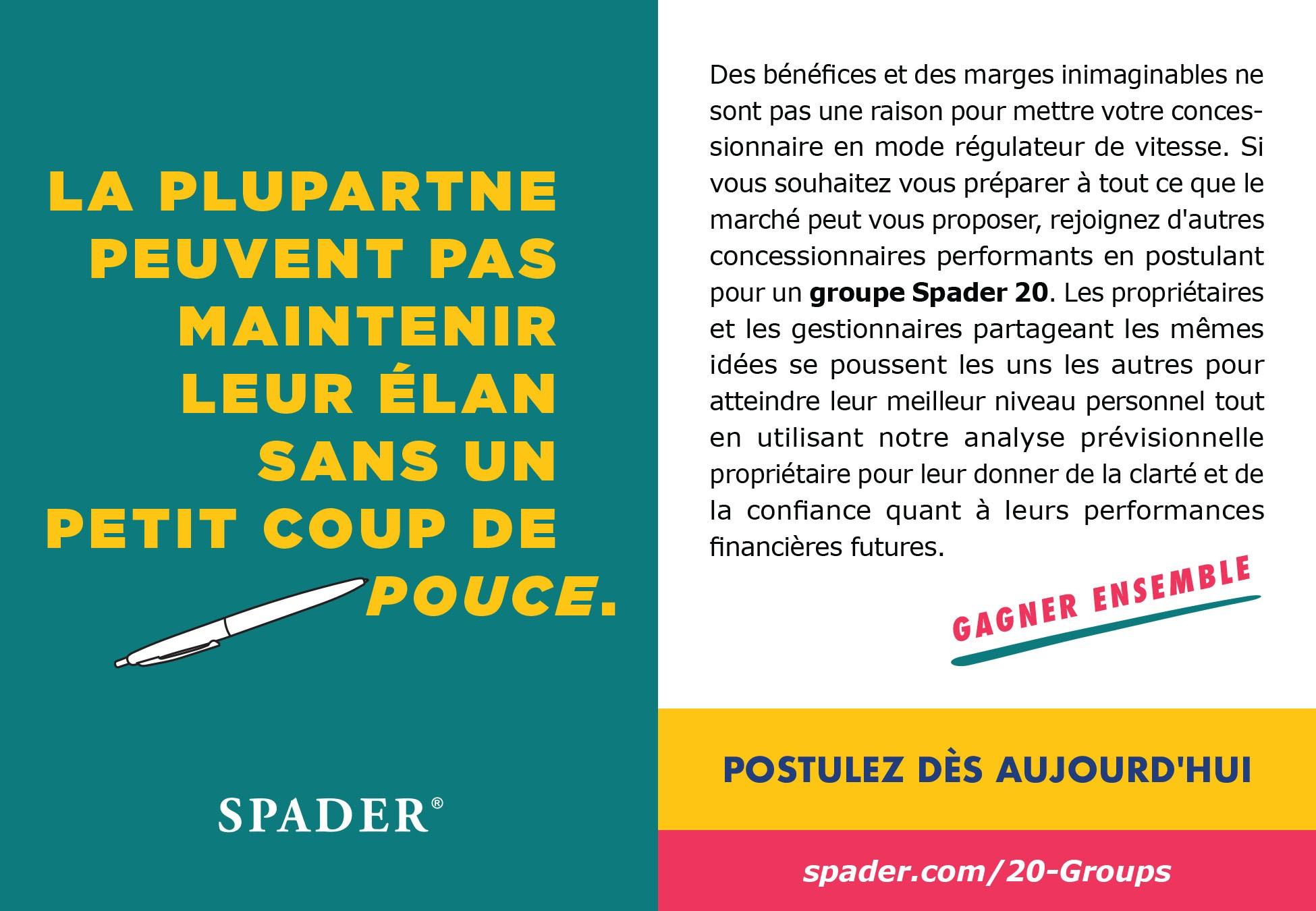 RVDA/Groupesdes20deSpader,gérésparSpaderCompanies,aidentlesconcessionnairesà améliorerleurscompétencesengestion,àdécelerlestendancesdumarchéetàrésoudrelesproblèmes.