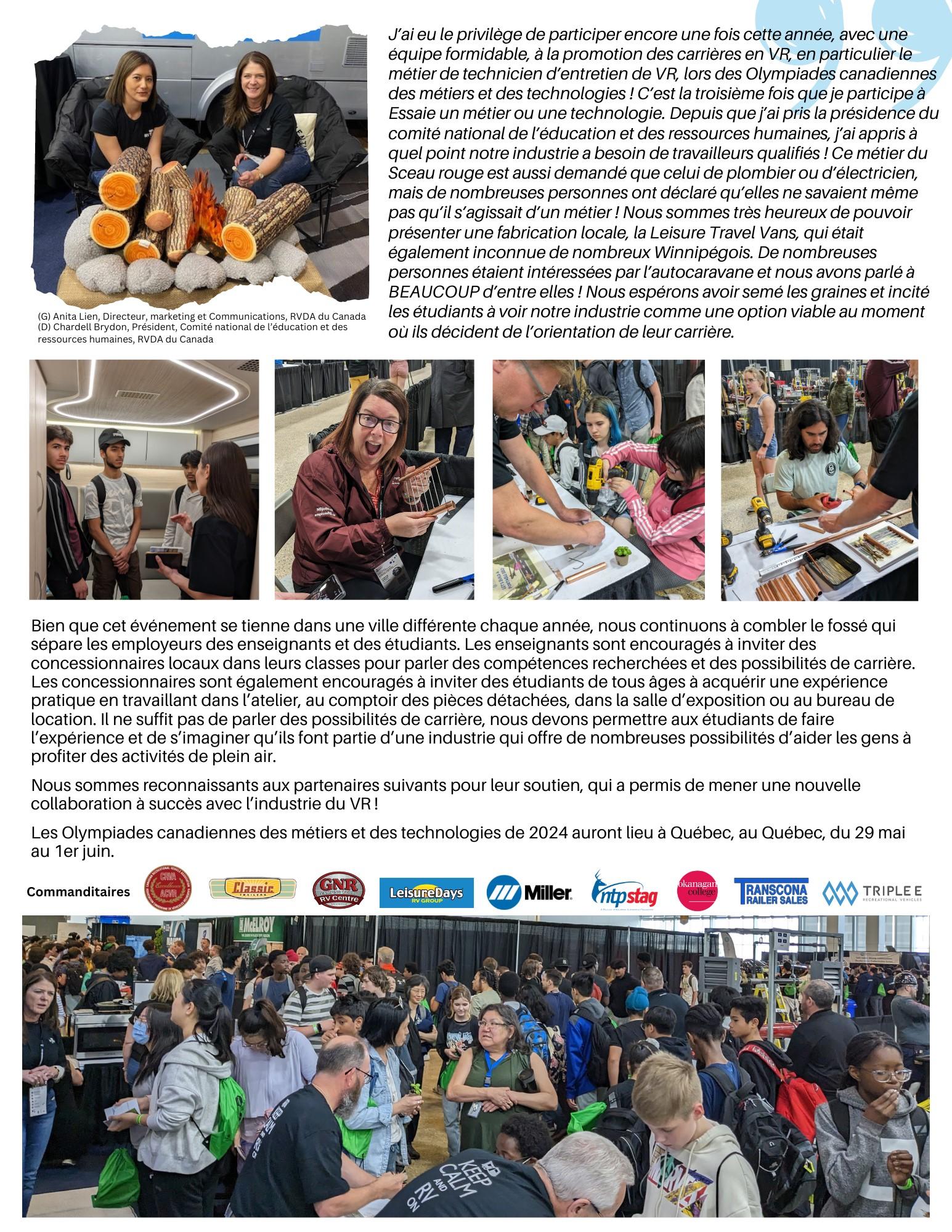 Je vous rappelle qu’à la page 23 de ce numéro, vous trouverez un formulaire de mise en candidature pour le prix de concessionnaire canadien pour l’année 2023. Je vous invite à penser à qui vous voudriez nommer. Si vous connaissez un concessionnaire qui a montré un grand dévouement à l’industrie du VR et à son mode de vie, à ses clients, à ses employés et ses homologues et a contribué à la communauté, alors envoyez sa candidature. Et, à partir de cette année, les mises en candidature seront valides pour une période allant à trois ans. Il sera rendu hommage au récipiendaire du prix 2023 à l’assemblée annuelle de la RVDA qui aura lieu dans le cadre du Congrès à Las Vegas.