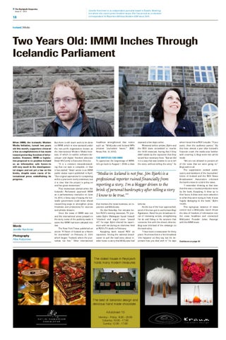 when I meet him at RÚV’s studio. “If you panic, then the audience panics.” By this time, almost a year after Iceland’s financial crash, the media was familiar with covering it. Bogi went into ad-lib mode: “We are not allowed to present all of the news that we were going to,” Bogi said on air. The suppression evoked public outcry and members of the Journalists’ Union of Iceland and the RÚV News Broadcasters’ Association criticised the bank’s move to control the news. “I remember thinking at that time that this was a counterproductive move by the bank, Kaupþing. It blew up in their faces. It drew even more attention to what they were trying to hide. It was hugely damaging to the bank,” Björn recalls. This egregious instance of news control over a WikiLeaks report thrust the idea of freedom of information into the news headlines and connected WikiLeaks’ Founder Julian Assange with the IMMI team.