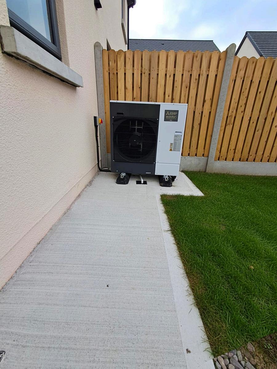 Each dwelling is equipped with a Mitsubishi PUZ-WM50VHA monobloc air-to-water heat pump paired with a Mitsubishi EHPT20X-MHEDWR1 pre-packaged cylinder and FTC7 control system. This combination provides space heating via steel panel radiators on both floors and delivers efficient domestic hot water production using plate heat exchanger technology for rapid recovery
