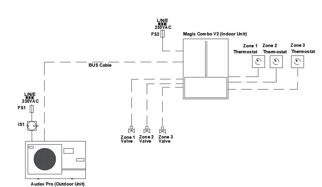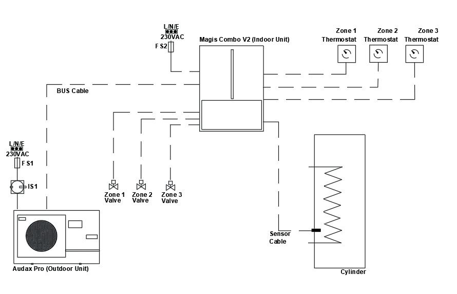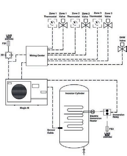 Cable Sensor Electric Heater Immersion Immersion Relay FS3 L/N/E 230VAC L/N/E 230VAC FS1 IS1 Magis M Thermostat Zone Thermostat Zone Pump Zone Pump Zone Valve DHW