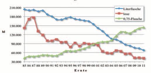 Südtirols Kellereien setzen immer mehr auf Qualität. Das zeigt sich auch in der Abfüllung. Sowohl der lose Verkauf als auch der Verkauf in Literflaschen gingen weiter zurück,