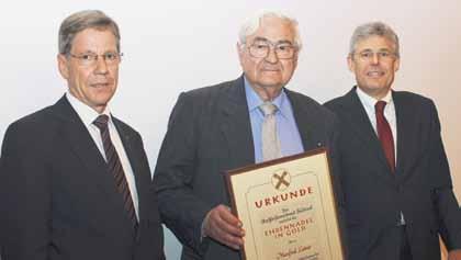 Nach 47 Jahren im Verwaltungsrat, davon 33 Jahre als Obmann, ging mit Manfred Leiner ein lang gedienter Genossenschafter von Bord. „Für mich war es eine Lebensaufgabe“, sagte Leiner, der 1966 in den Vorstand und 1980 zum Obmann der Raiffeisenkasse Marling gewählt wurde. „Manfred Leiner hat sich als glaubwürdiger Genossenschafter bleibende Verdienste erworben“, sagte Herbert von Leon, Vizeobmann des Raiffeisenverbandes, in seiner Laudatio. Er überreichte Leiner die RaiffeisenEhrennadel in Gold. Manfred Leiner kann auf eine 55-jährige genossenschaftliche Tätigkeit zurückblicken. 1958 wurde er Vorstand der Kellereigenossenschaft Marling und war u. a. in den Gremien der Sennereigenossenschaft Marling tätig. In der Obstgenossenschaft COFRUM war er von 1970 bis 1990 Aufsichtsrat, davon 16 Jahre Vorsitzender. Von 1970
