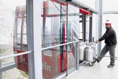 Christian Gamper bringt die Milch täglich um 7 Uhr früh zur Seilbahn St. Martin am Kofel, die sie zu Tal transportiert, wo sie dann vom Mila-Sammelwagen abtransportiert wird.