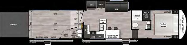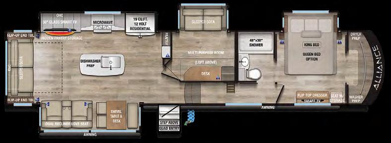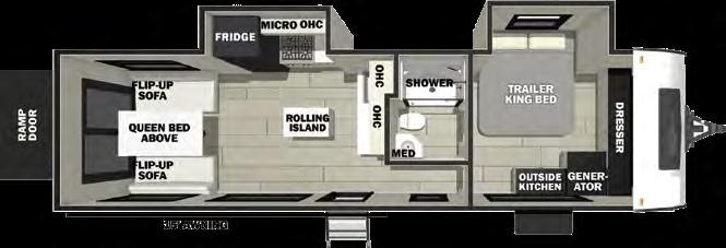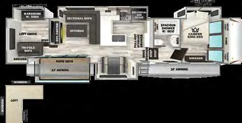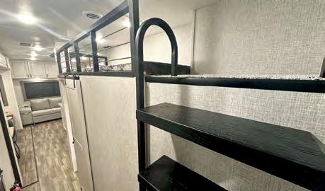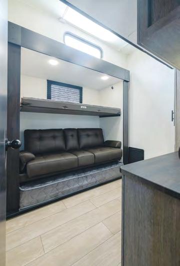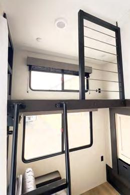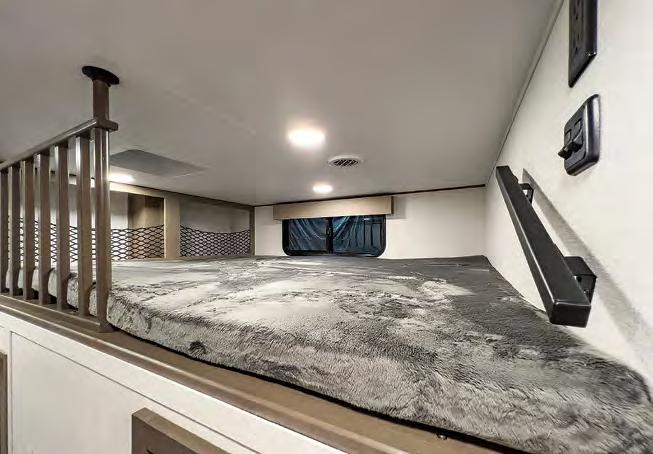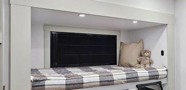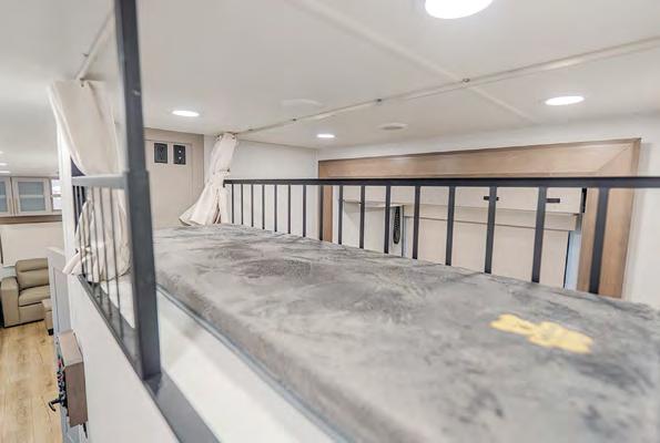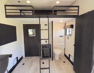 The mid-bunk room easily transforms into a guest bedroom, kids’ space, or dedicated home office, featuring a built-in desk and generous storage. The queen-size loft adds extra sleeping quarters or a convenient place to stash gear. And when it’s time to unwind, the rear patio deck invites you to enjoy the outdoors—it’s ideal for lounging, dining, or entertaining under the open sky.