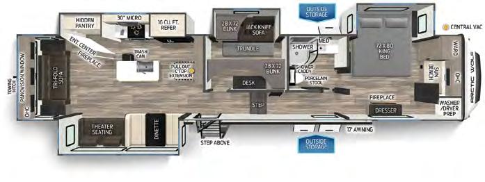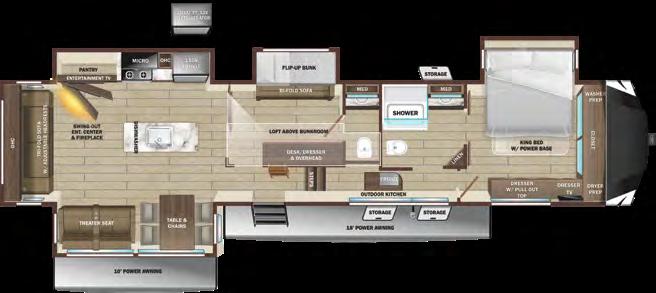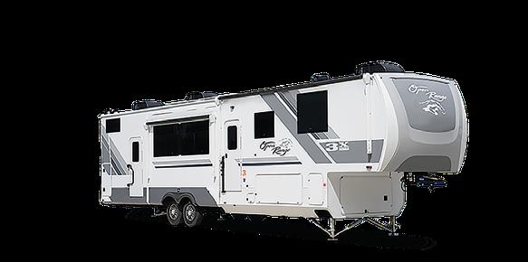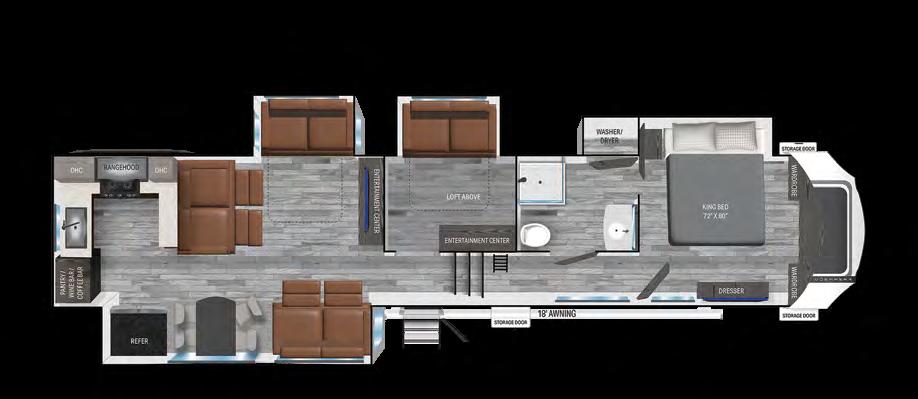 With ample storage, this fifth wheel model from Grand Design contains a middle room with a trifold sofa for lounging and a built-in desk for working. The sleepable space is above with a 64-by-88-inch loft. You’ll also find unobstructed pass-through storage below, and many other features that allow you to enjoy the great outdoors, such as two awnings and an outdoor refrigerator and griddle.