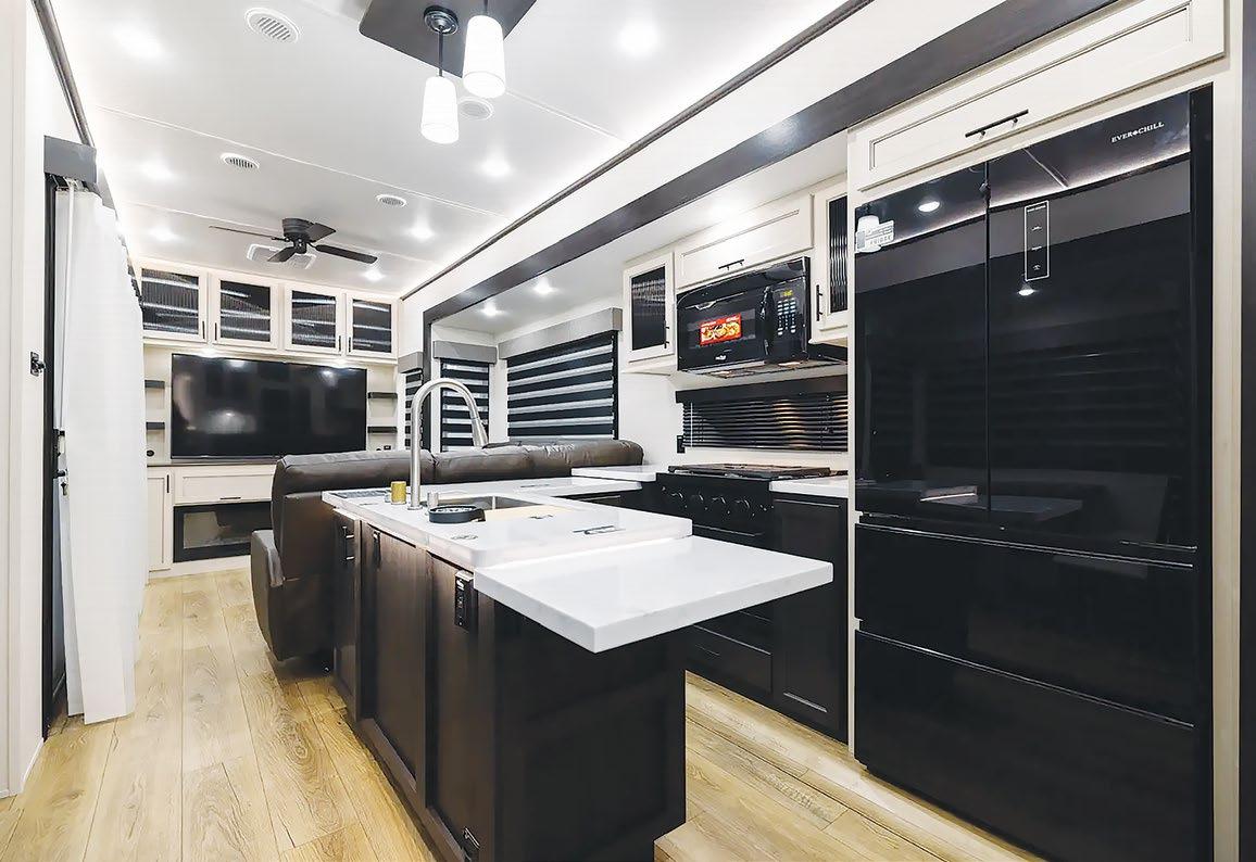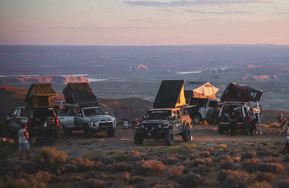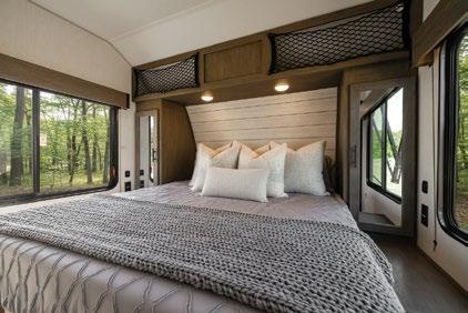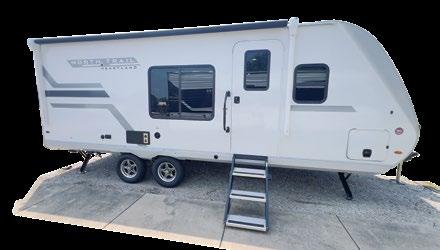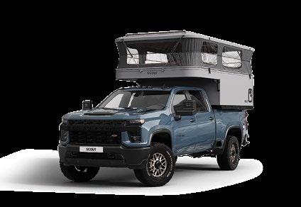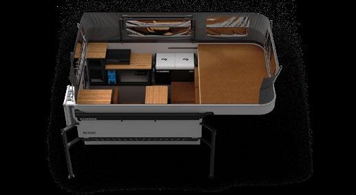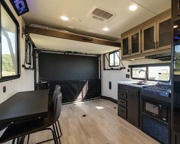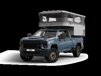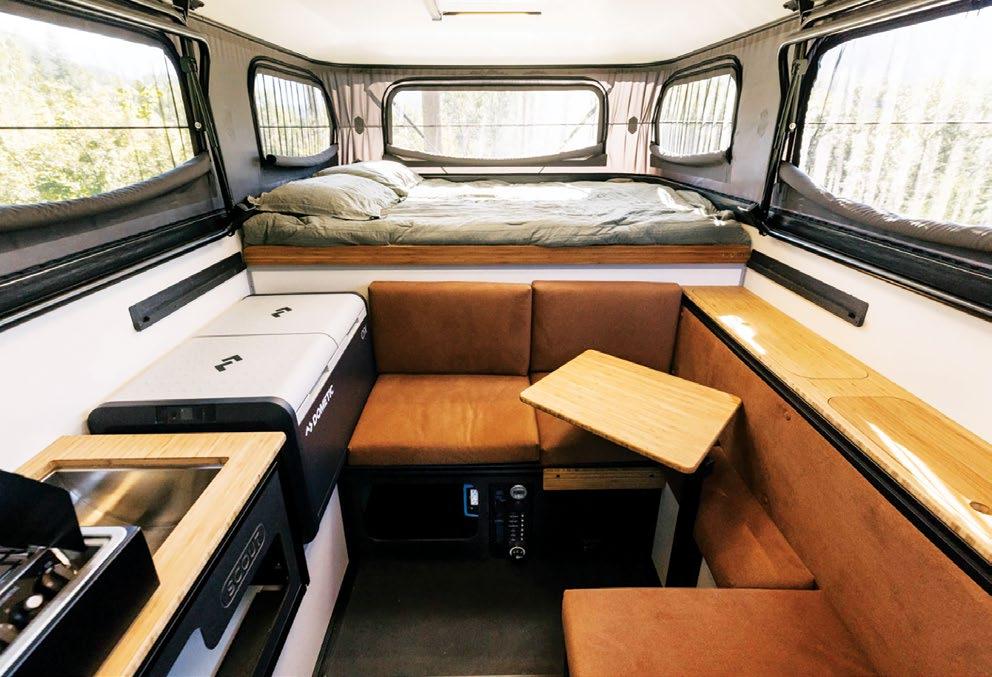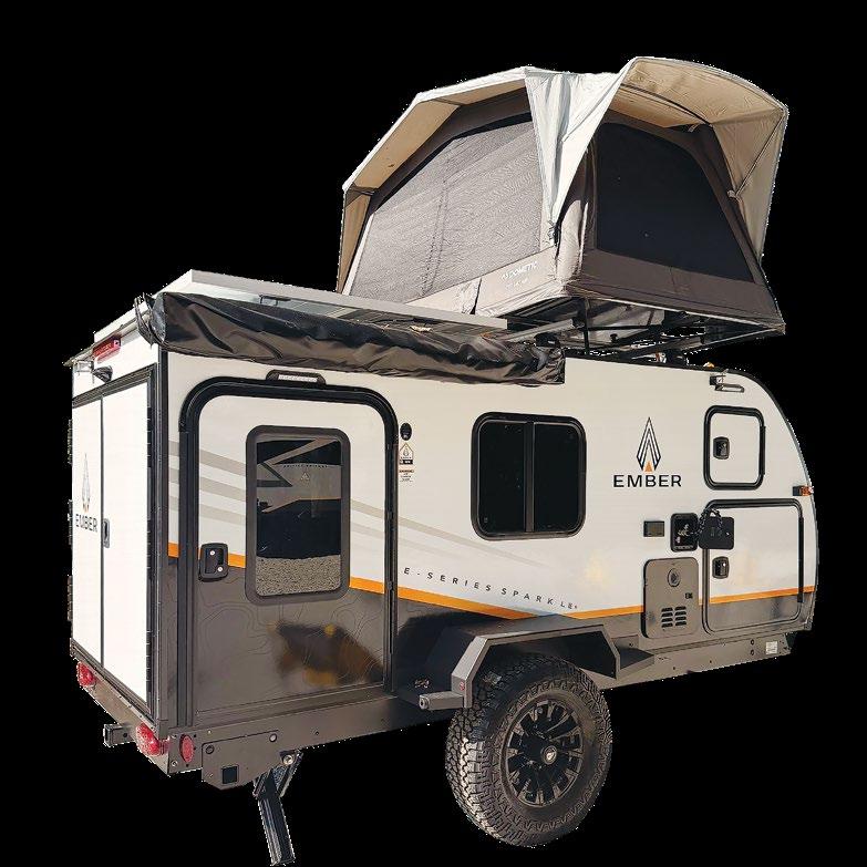 THIS MICRO TRAILER FROM EMBER RV PACKS A BIG PUNCH, with all the basics you need to get out and go. The pull-out kitchen lets you cook outside, and two can sleep comfortably inside—plus, a rooftop tent can add more sleeping space. At a dry weight of just 1,830 pounds, it’s towable with almost any vehicle. For more information, visit rvtoday.com/12FK