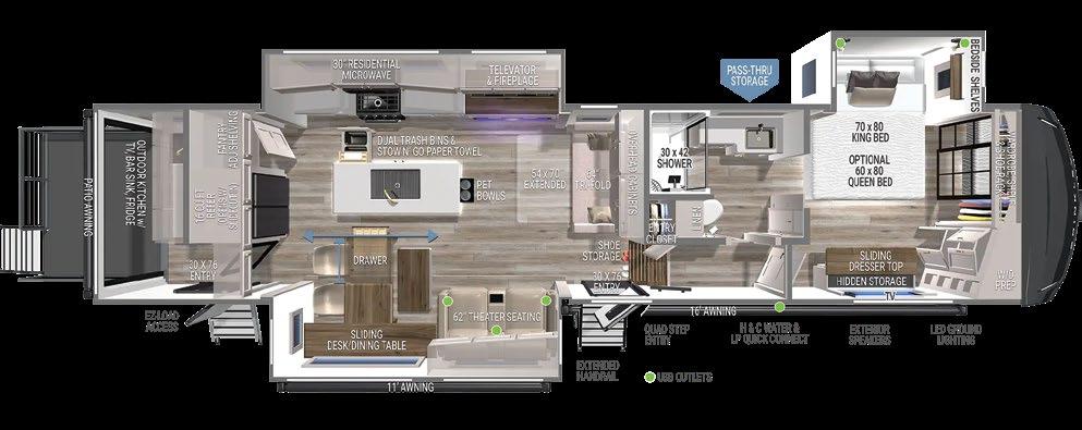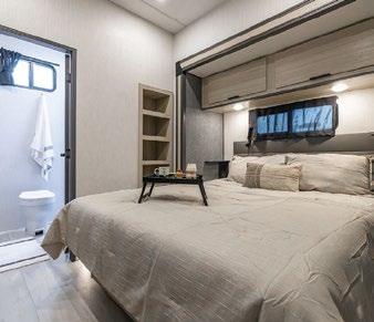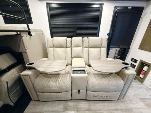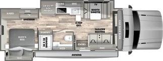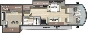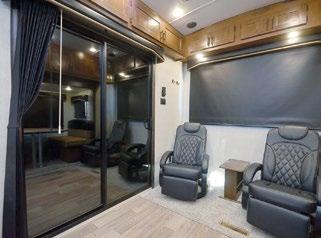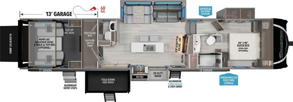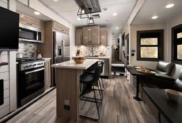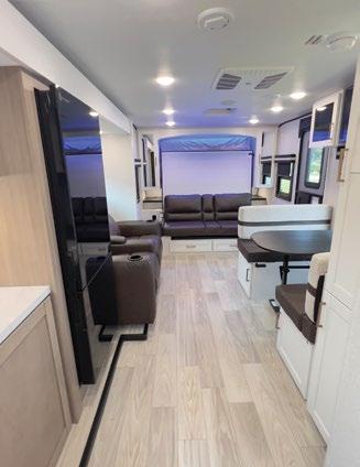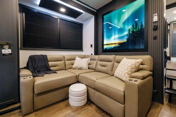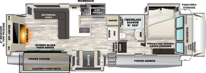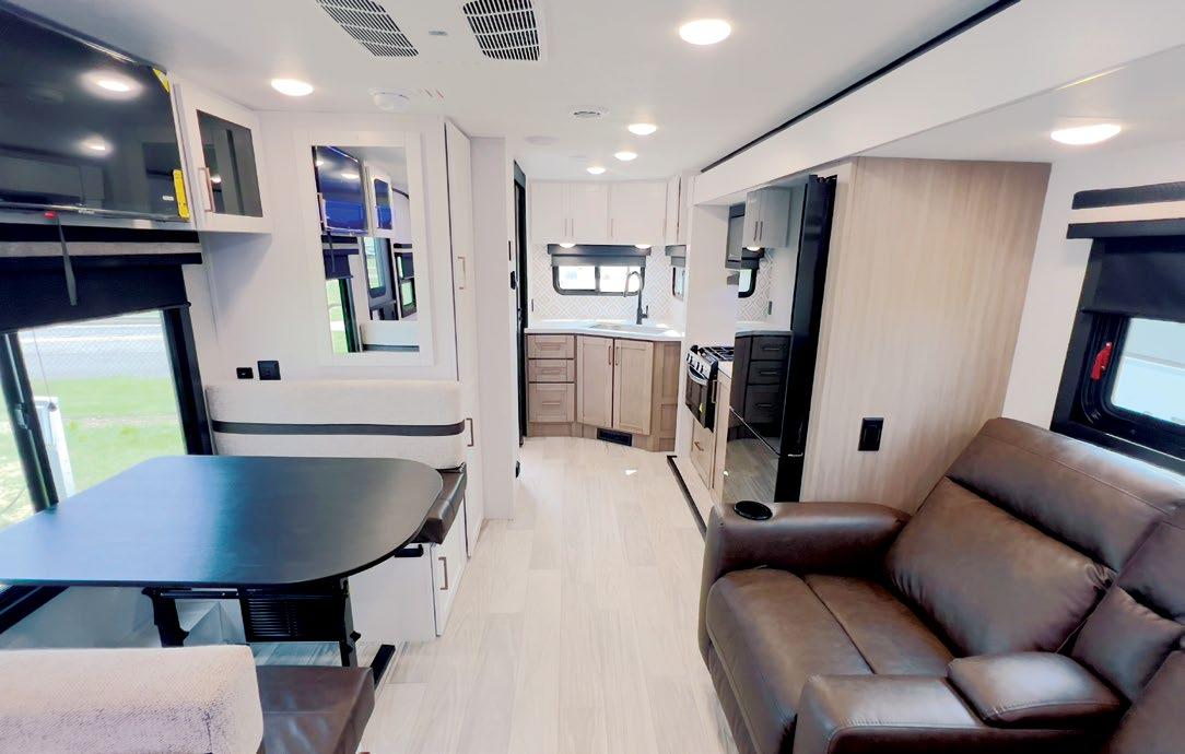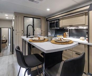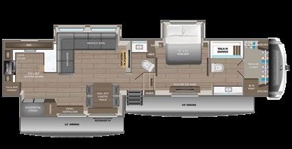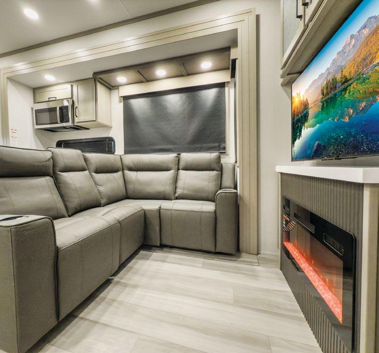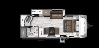 Designed to be a couple’s coach, this floor plan has a folddown side patio with an awning. The rear living room contains a sectional sofa and an entertainment center for rainy days or cozy movie nights. You can also convert the sectional into a bed for guests or grandkids.