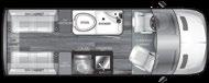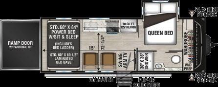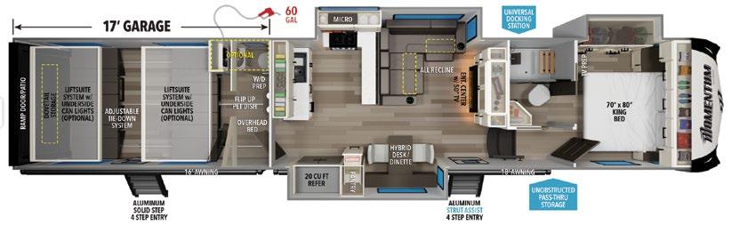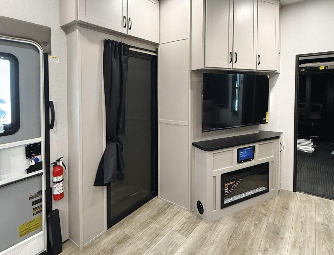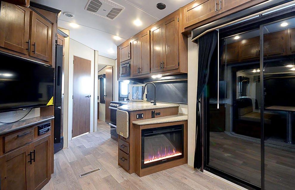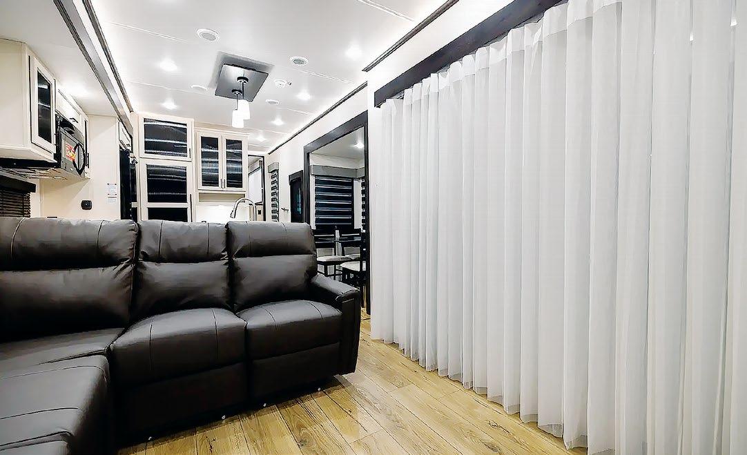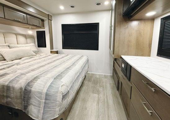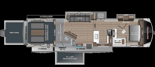 Designed to be a couple’s coach, this floor plan has a folddown side patio with an awning. The rear living room contains a sectional sofa and an entertainment center for rainy days or cozy movie nights. You can also convert the sectional into a bed for guests or grandkids.