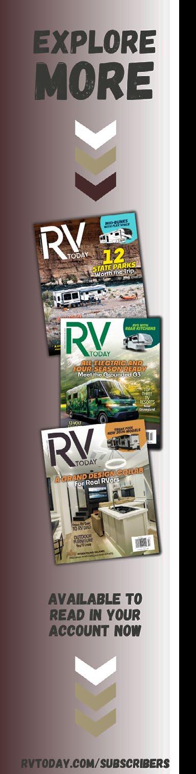 RV Today magazine is published in print and digital formats eight times yearly. The rate is $10 for a one-year digital subscription with unlimited access and downloads. The rate is $25 for a lifetime digital subscription with unlimited access and downloads. The rate is $30 for a oneyear print subscription, including eight print issues, plus complimentary digital access and downloads. Subscription rates and options are subject to change. View current pricing and subscribe at rvtoday.com/subscribe.