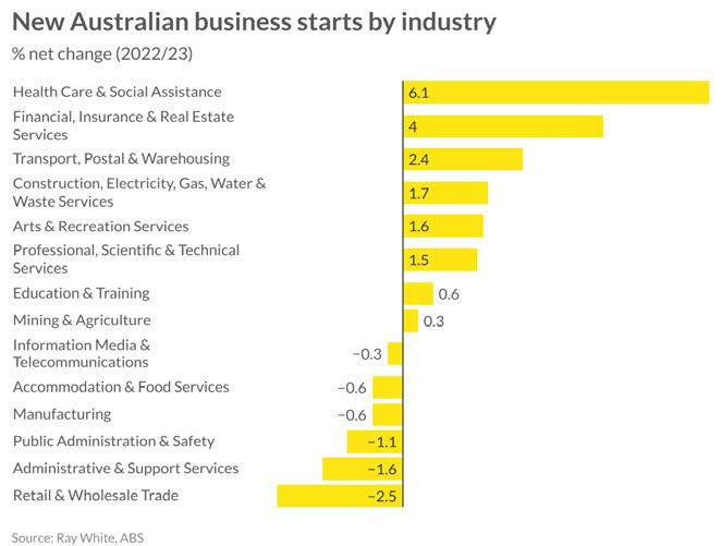 Despite the woes of many office markets across the country, new business starts in the professional sectors including finance, insurance and real estate may see the office market turn a corner, while retail continues to be a difficult business and asset class. With rising interest rates, retail trade has seen some reduction and the tightening of belts has seen business counts reduce, down 2.5 per cent across the retail and wholesale trade category.