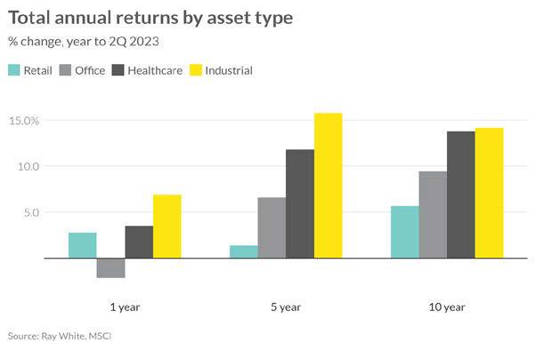 After strong turnover levels in the last few years, increased interest rates have done much to dampen investment demand, for those in the market the healthcare and industrial sectors represent good buying given their limited supply and strong occupancies fuelled by new and growing businesses and our growing population. Over the last year returns have favoured these assets up 3.5 per cent for healthcare and 6.9 per cent for industrial, with retail total returns remaining positive given its income stability at 2.8 per cent while office has started its fall, recording -2.2 per cent this period.