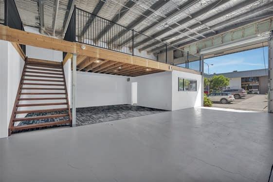 This property features a spacious, well-lit industrial warehouse with high ceilings, an internal mezzanine office space, and ample room for workshop or storage use.