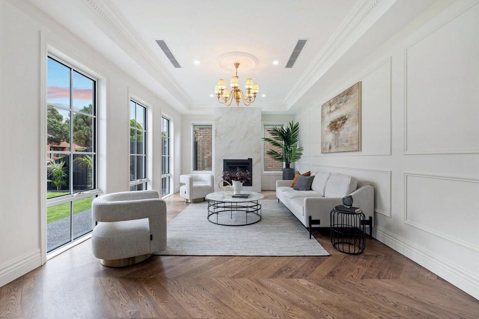 Crafted without compromise, the home reveals premium parquetry flooring, high ceilings with decorative cornices, sleek wainscoting panelling and top-ofthe-rang e appointments highlighting every space