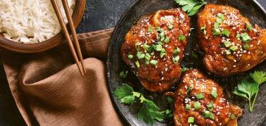 1⁄2 cup tomato sauce 1⁄4 cup balsamic vinegar 2 tbsp dark brown sugar 4 tbsp granulated garlic 4 tbsp Worcestershire Sauce 3 tbsp Tabasco Sauce 2 tbsp Dijon Mustard 2 tbsp paprika 2 tbsp chilli powder In a medium bowl, whisk together the marinade ingre- dients. Rinse the chicken pieces under cold water and pat dry with paper towel. Place in a large, resealable plastic bag and pour in the marinade. Press any air out of the bag and seal tightly. Turn the bag to distribute the marinade, place in a bowl and refrigerate for 4 to 6 hours, turning occasionally. Remove the chicken from the plastic bag and discard the marinade. Lightly brush or spray the pieces with ol- ive oil. Sear over direct medium heat until well marked, for 4 to 6 minutes, turning once halfway through searing time. Continue grilling over indirect, medium heat until the meat is no longer pink at the bone. Serve warm