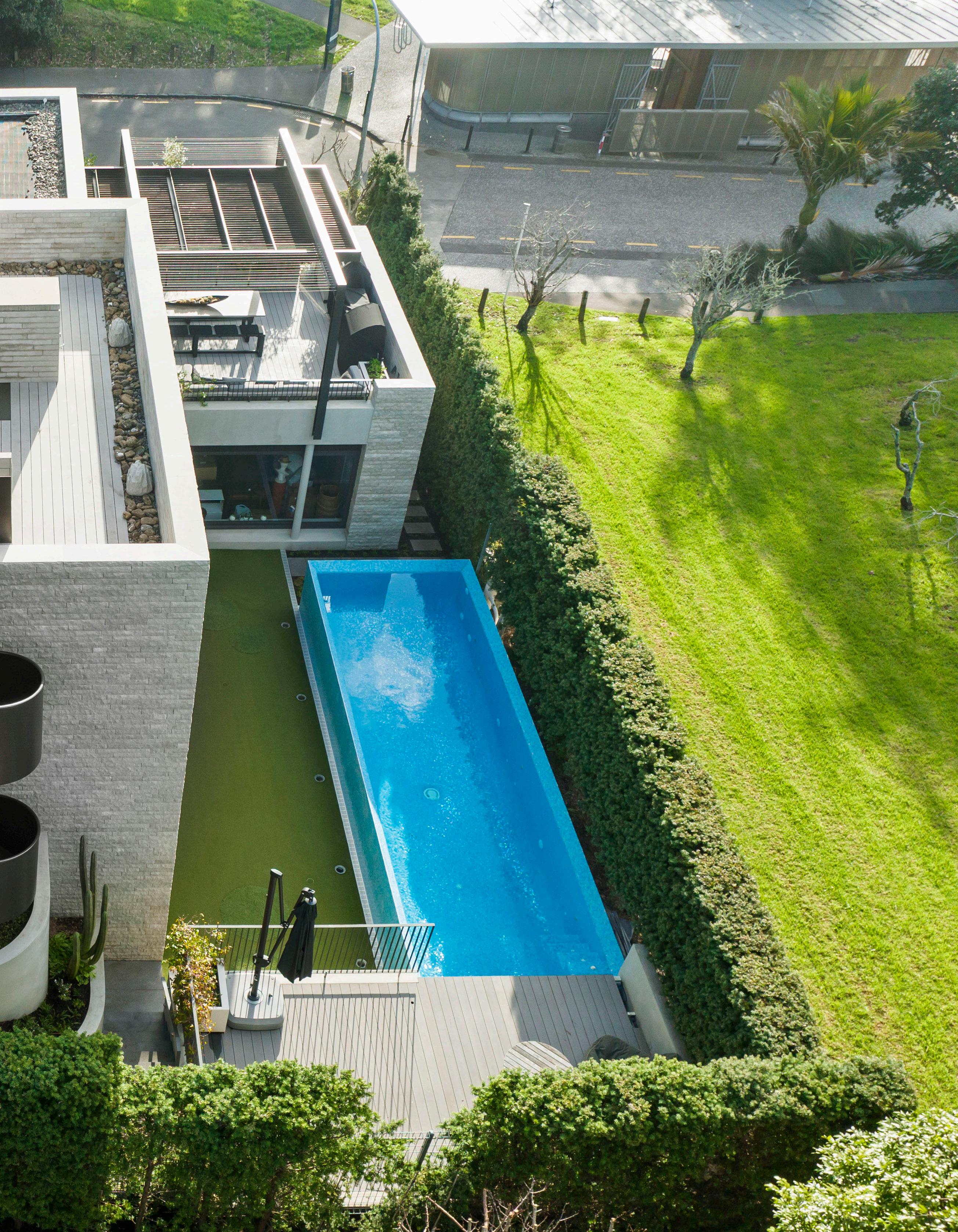 All bedrooms radiate outwards from a grand entranceway, with three elegant bathrooms of various sizes and doors opening directly out to a salt water pool. An internal courtyard garden brings a sense of nature within, before solid totara stairs ascend to a lifestyle-lead living hub on the upper floor. Here multiple entertaining spaces include a formal dining room and casual lounge flowing out to spacious north-facing entertaining, while a formal lounge, office and guest powder room complete the picture. The final touch is a rooftop oasis, with open fire, wood-fired hot tub and views across Judges Bay.