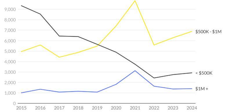 constrained recovery. Unit sales declined 37 per cent from 15,303 in 2015 to 9,654 in 2022, then partially rebounded 16% to 11,207 in 2024. However, this recovery leaves unit volume 27 per cent below 2015 levels, and the unit market continues to mirror the broader pattern of strength in higher price segments while affordable options remain scarce.