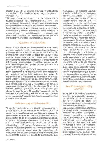 afectan a uno de los últimos recursos en antibióticos disponibles: los carbapenemes (ej. imipenem, meropenem…). *El preocupante incremento de la resistencia a fluoroquinolonas (ej. ciprofloxacina, etc.) en Acinetobacter baumannii-calcoaceticus, Pseudomonas aeruginosa y recientemente, en Klebsiella pneumoniae. Entre los gram-positivos, el aumento de resistencia a vancomicina y nuevos antibióticos como linezolid o daptomicina, en estafilococos y enterococos, principales causantes de infecciones graves de alta morbilidad y mortalidad en el medio hospitalario. Infecciones en la Comunidad En los últimos años se han incrementado las infecciones por estas bacterias multiresistentes en la comunidad, en pacientes sin relación con el medio hospitalario. El ejemplo más conspicuo son las cepas de Staphylococcus aureus adquiridas en la comunidad que son genéticamente diferentes de las clásicas productoras de infecciones hospitalarias y pueden causar desde infecciones de piel hasta graves lesiones pulmonares o en otros órganos nobles. Existen otros ejemplos de microorganismos comunitarios resistentes a los antibacterianos empleados para el tratamiento de las infecciones más frecuentes. El incremento en la frecuencia de aislamiento de bacilos gram-negativos resistentes en pacientes comunitarios. Preocupa la pérdida de actividad de las fluoroquinolonas para infecciones urinarias y respiratorias. Es también preocupante la aparición de infecciones por Clostridium difficile, principal productor de diarreas por uso y/o abuso de antibióticos. El notable incremento de la resistencia a macrólidos y azálidos en neumococos (una de las causas más frecuente de infecciones respiratorias) y otros gram-positivos. Acciones necesarias hacia un cambio Si bien la resistencia a los antibióticos es una preocupación global, en el contexto de América Latina se suman varios problemas que acentúan su gravedad: la permanente escasez en muchos países de recursos provenientes de los presupuestos nacionales para salud, lo que es reflejado por la carencia en número y calidad de recursos estructurales, humanos (médicos, microbiólogos, enfermeros, farmacéuticos, etc.) y de gestión. La pobreza que continúa siendo dramática y con ella un problema grave para la transmisión de infecciones debido principalmente al hacinamiento, que no solamente ocurre en el ámbito domiciliario, sino 30