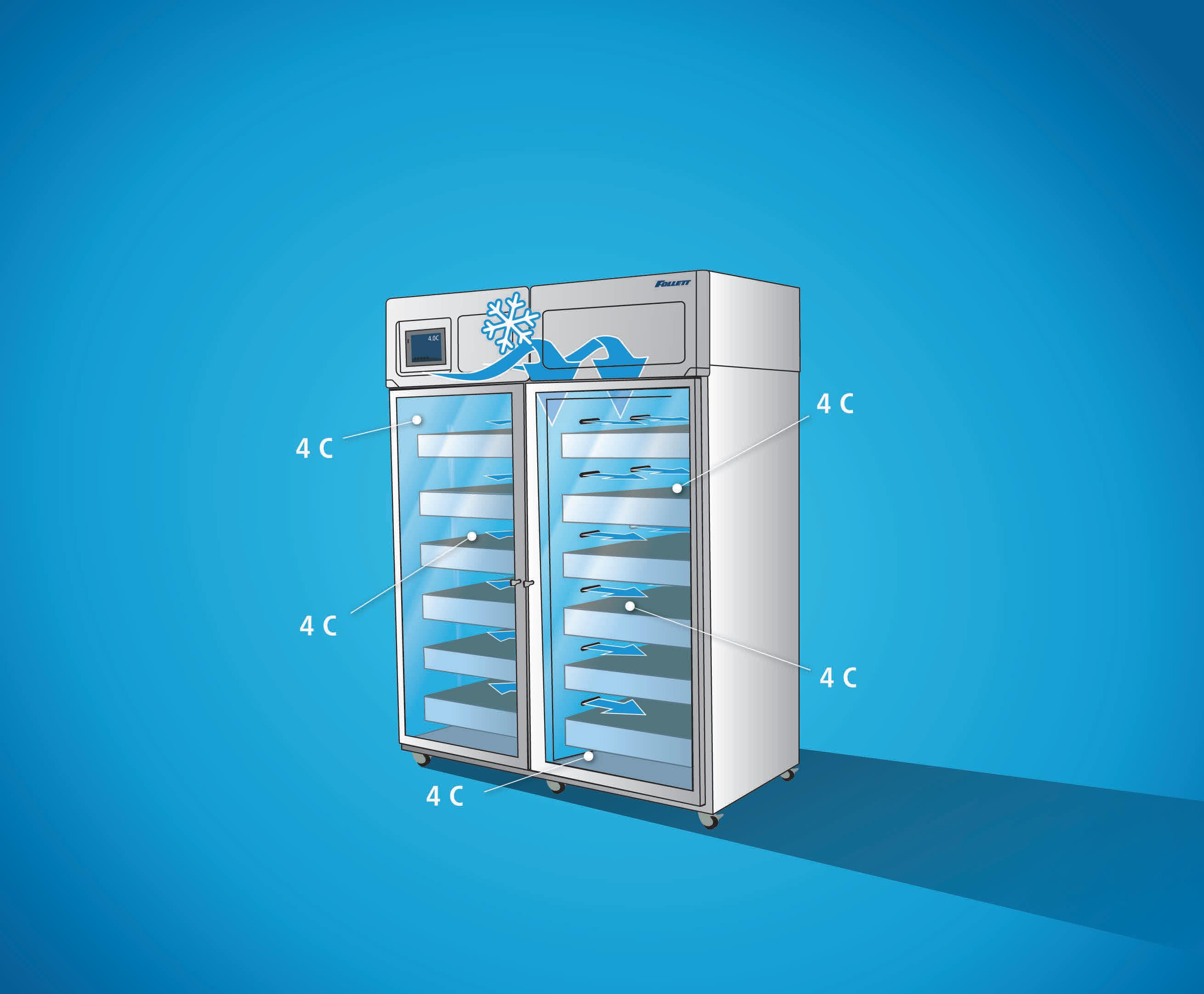 When it comes to product temperature accuracy, there is no room for error. Follett upright refrigerators and freezers feature our exclusive plenum air distribution which delivers cold air at multiple levels to ensure consistent top‑to bottom temperatures, even when heavily loaded with product.