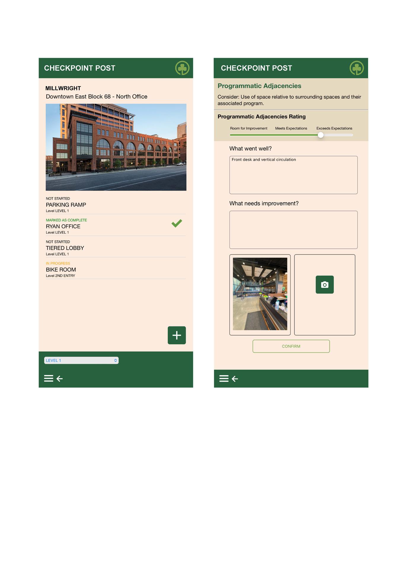 CHECKPOINT POST CHECKPOINT POST CLARENDALE CLAYTON NOT STARTED PARKING Level LEVEL 1 MARKED AS COMPLETE STAFF OFFICES Level LEVEL 1 NOT STARTED TIERED LOBBY Level LEVEL 1 IN PROGRESS MC COURTYARD Level LEVEL 1 LEVEL 1 Programmatic Adjacencies Consider: Use of space relative to surrounding spaces and their associated program. Programmatic Adjacencies Rating Room for Improvement Meets Expectations Exceeds Expectations What went well? Front desk and vertical circulation What needs improvement? CONFIRM