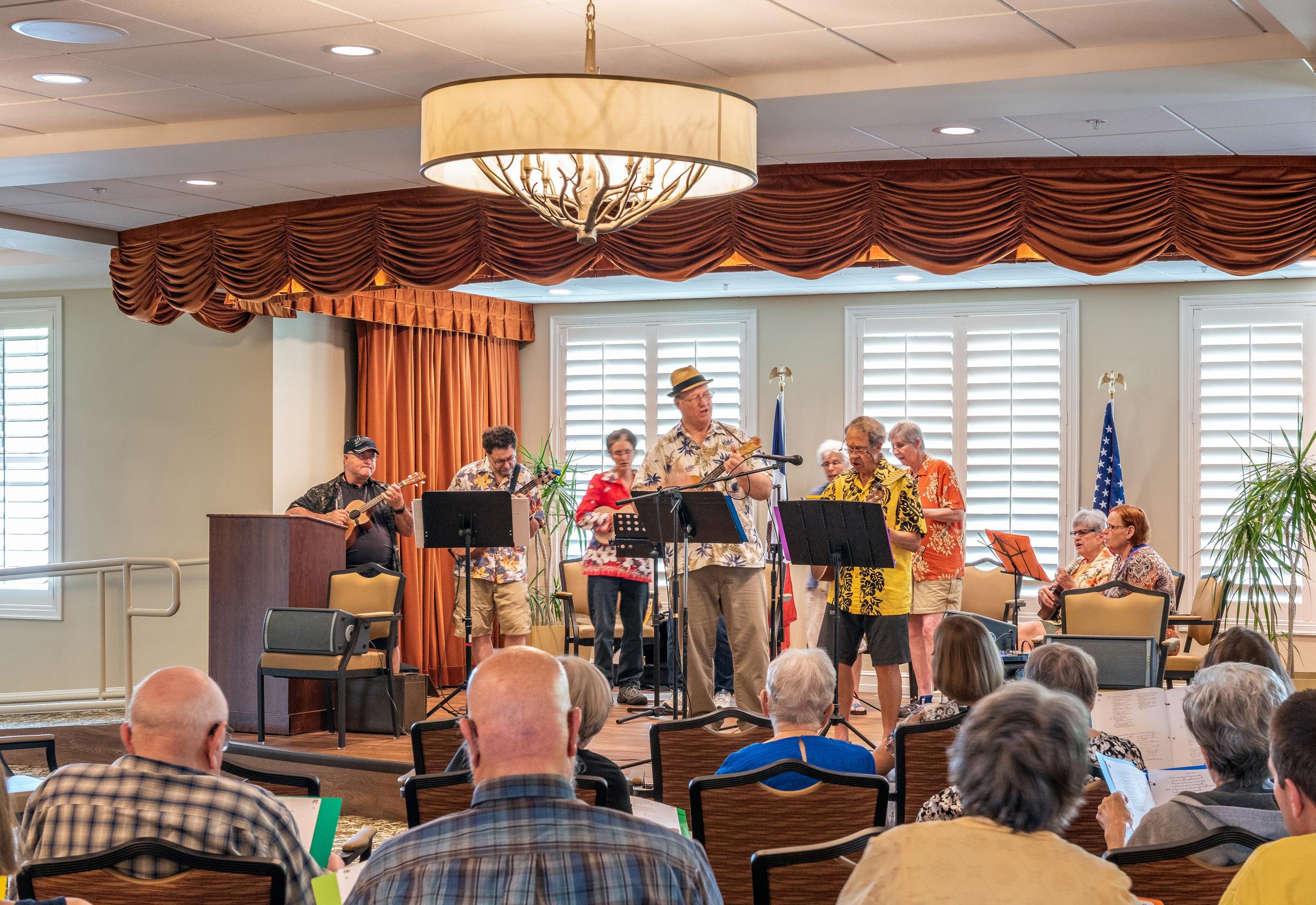 Participating in wellness activities together can foster a sense of community and contribute to well being on multiple levels. Examples include barre stretching, chair exercises, games with weighted balls and yoga. Residents can also enjoy a variety of outdoor activities such as shuffleboard, swimming, water aerobics, golf, tennis, pickleball and more.