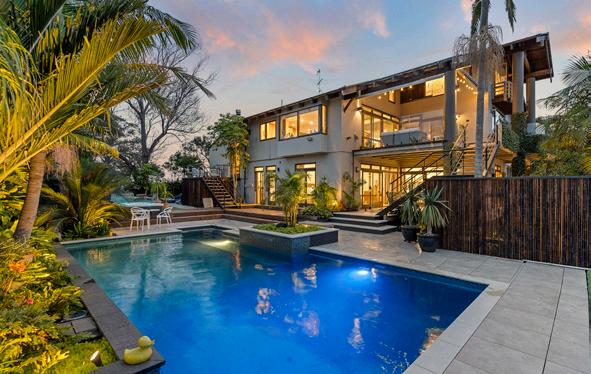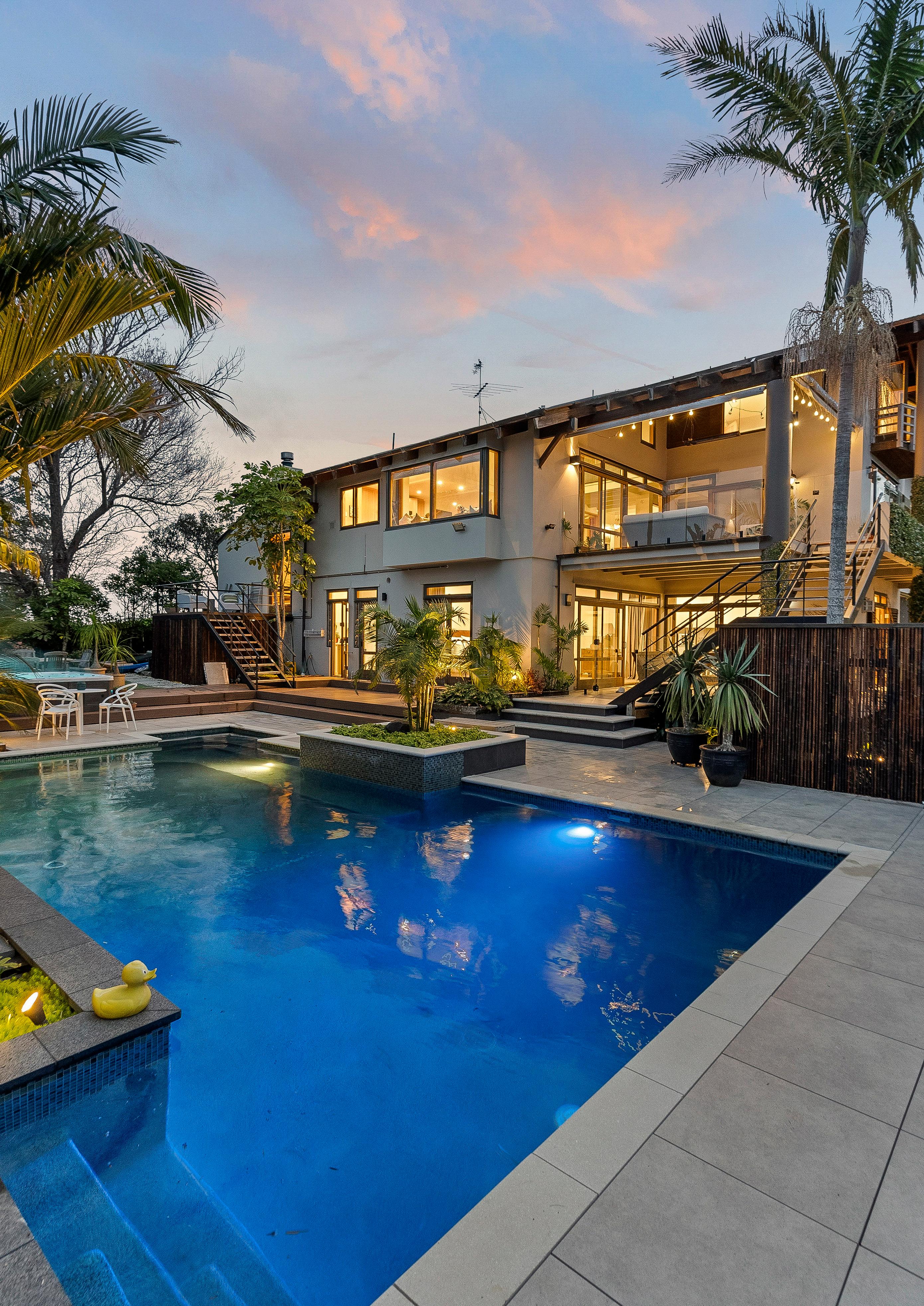 Holiday at home with the resort-style pool complex, surrounded with low maintenance tropical gardens and astro turf lawns. Large decks and terraces open out to both sides of the house delivering the ultimate indoor/outdoor living in all conditions.