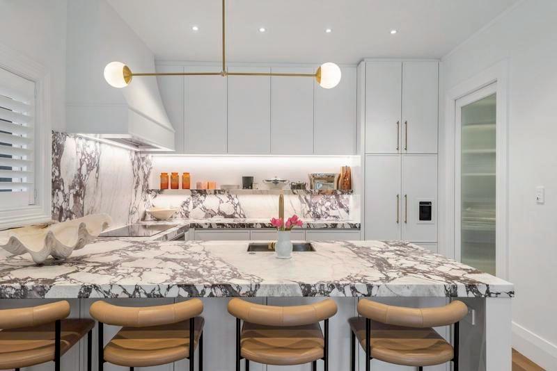 The middle level opens to an expansive sun-kissed deck, perfect for entertaining and enjoying seamless indoor-outdoor flow. Here, you can relax and listen to the birdsong or watch the children play on the large, flat backyard below. The marble entertainer's kitchen boasts stunning cabinetry, a fluted glass door scullery and wine fridge, a stylish powder room, laundry with extensive storage, and a second living room with a beautiful bay window.
