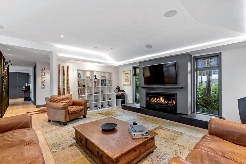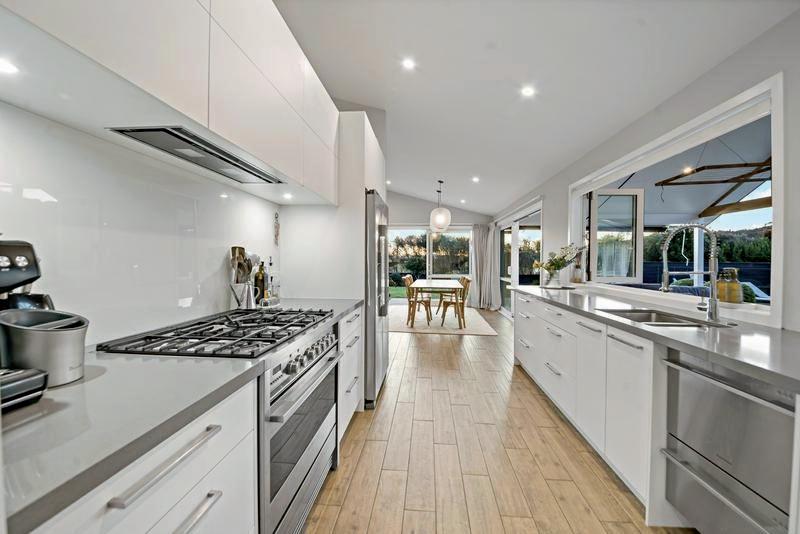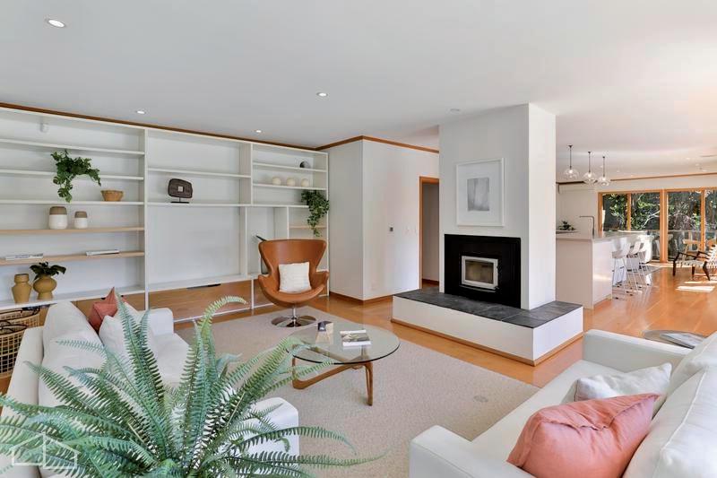 Every detail has been thoughtfully curated, from a Studio Italia kitchen, Travertine benchtop, indoor gas and outdoor wood fires. It has three ensuite bathrooms, a powder room, and charming oak floors within its cedar structure. Insulated and double-glazed, it ensures comfort. An attached three-car garage and off-street parking add convenience.
