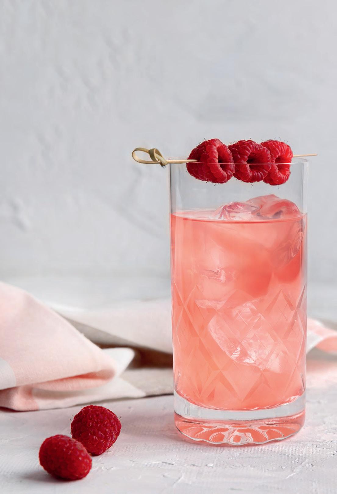 6. Pour into a chilled martini or highball glass, top with a splash of champagne and garnish with your fresh raspberries.