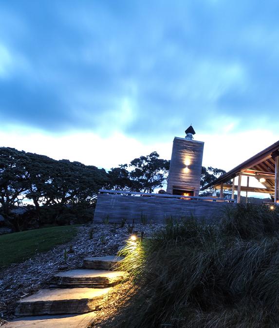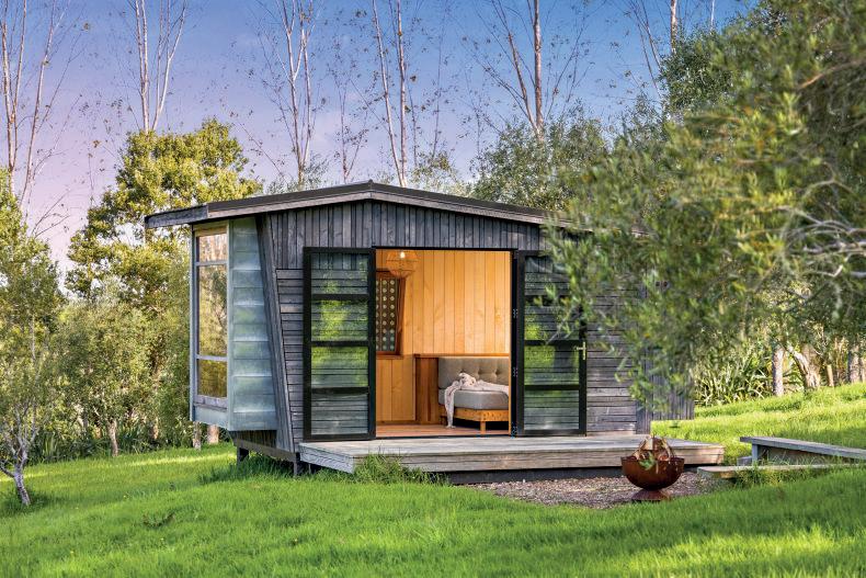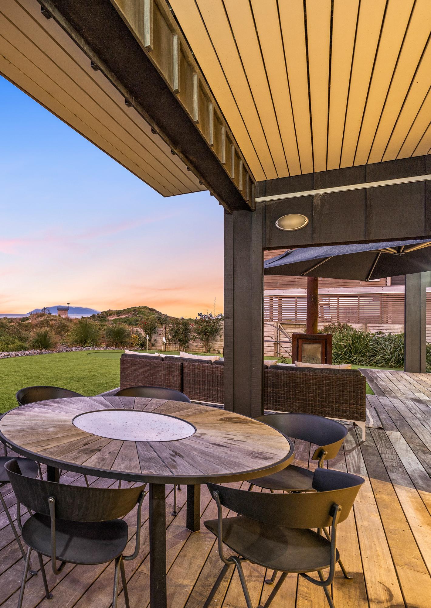 Te Whara, designed by Andrew Patterson, offers a completely different experience with room to host up to seven people. The three-bedroom and two-bathroom shed-styled statement building offers generous living spaces, a separate sleep-out, a large flat lawn area, and access to its own private cove.
