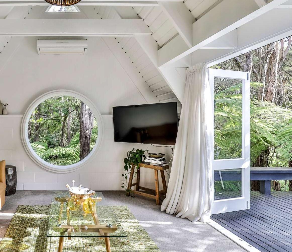 The split-level main living area includes the kitchen, dining and living with spacious vaulted ceilings and glass doors flowing outside to a large deck and private garden to enjoy an abundant native planting backdrop.