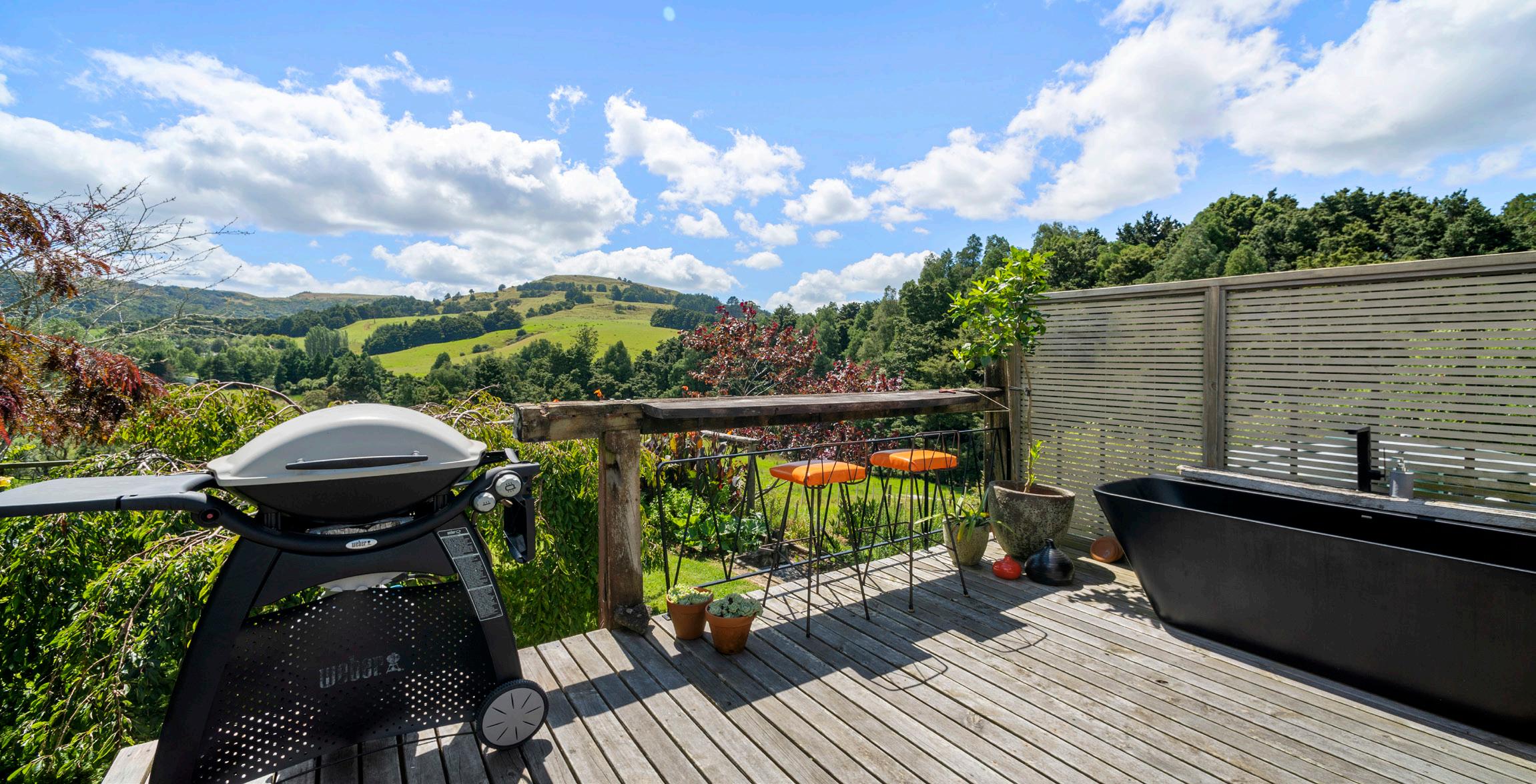 You enter 'Puketiro' through the old stone gateposts and along the tree lined drive. Passing by flat paddocks and over a cute bridge you arrive at the peaceful elevated home surrounded by lawn, gardens and orchards. There is an expansive covered verandah for outdoor dining and the farmhouse kitchen spills out through French doors to a balcony with spectacular views over the countryside. Imagine enjoying a morning coffee, a sunset cocktail or an evening soak in the outdoor bath on the deck.