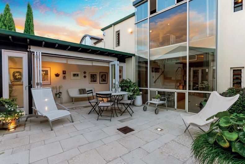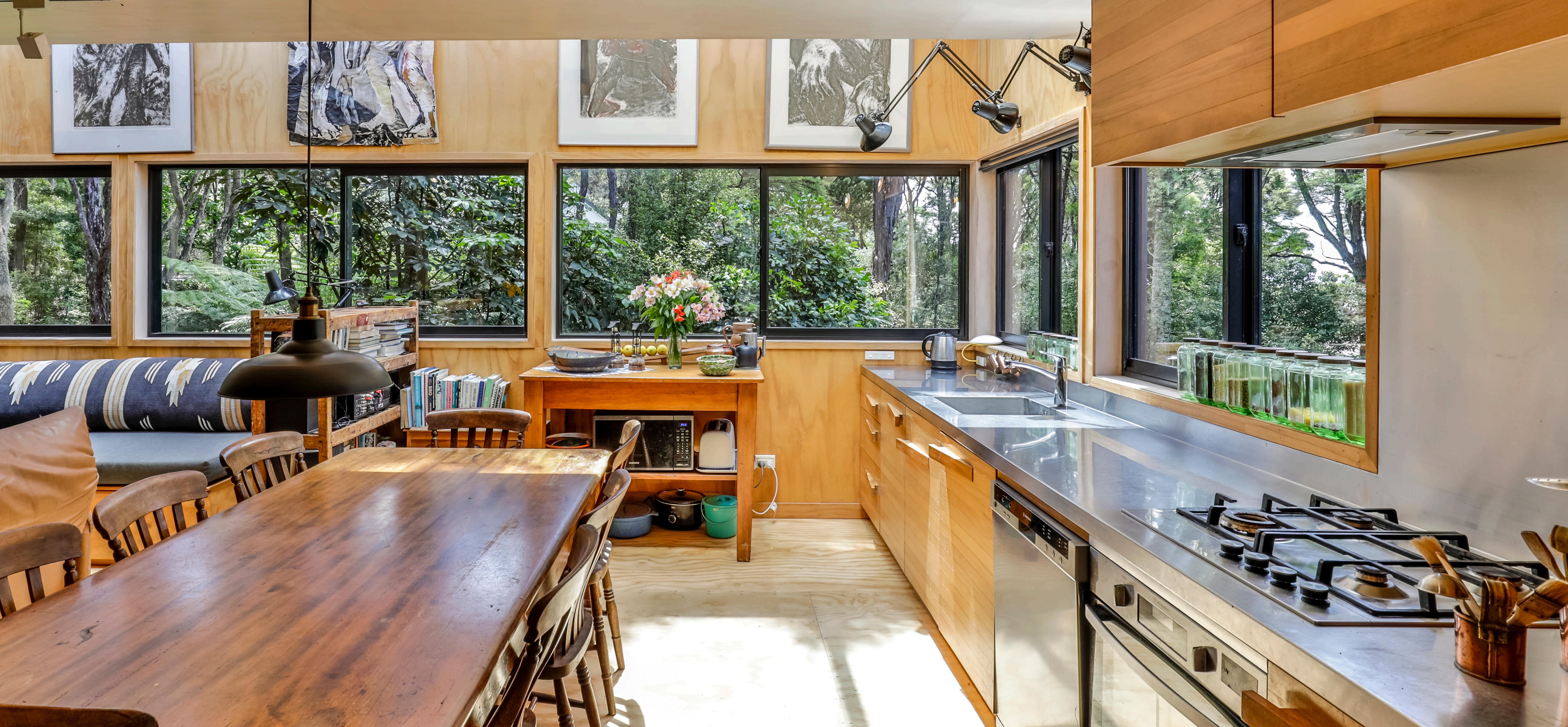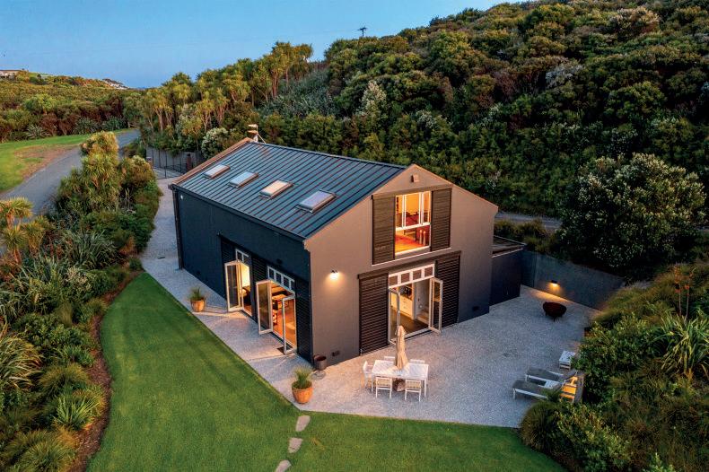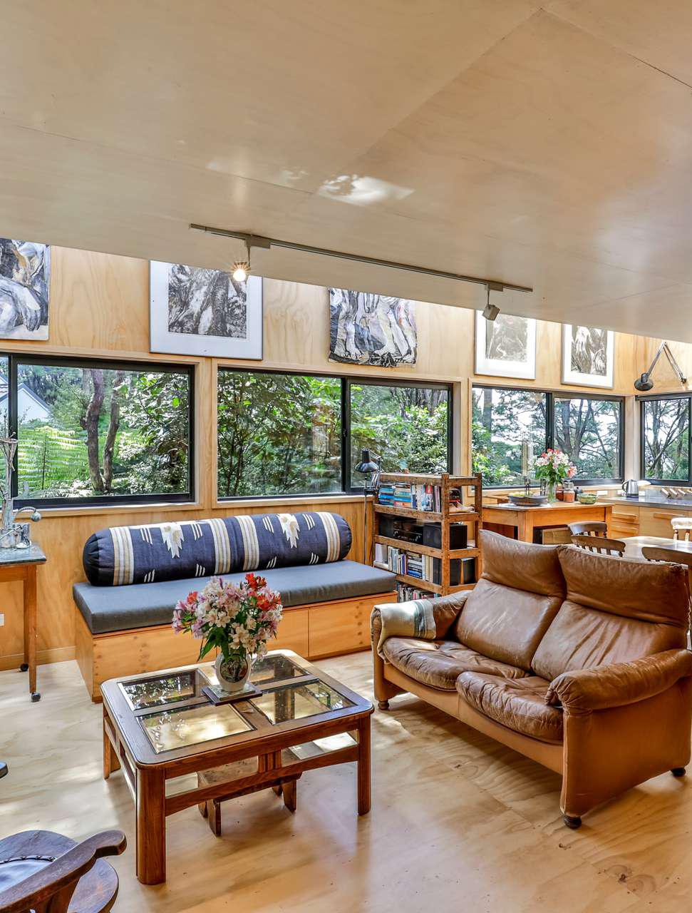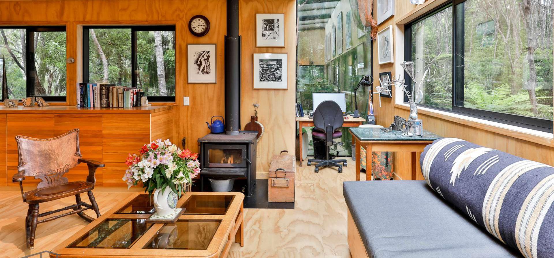 In keeping with the main living area on the second level of the home, the kitchen offers inset appliances, recycled Rimu custom cabinetry with standout door pulls and gleaming worktops uniting the space with understated beauty. Gallery lighting and a freestanding fireplace create a warm and inviting atmosphere. Two private bedrooms and a full bathroom are on ground level, plus a studio or home office with its own access.