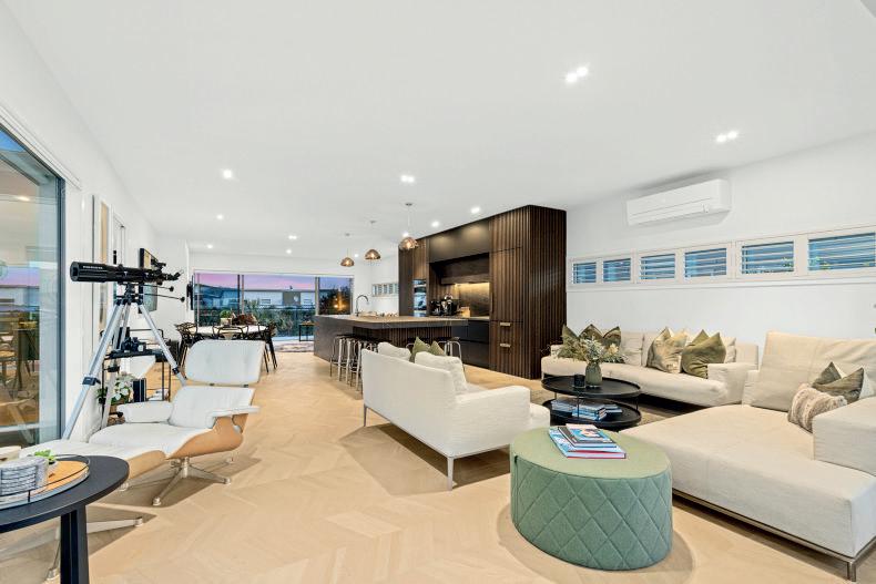 The stylish open plan central living level delivers a wealth of built-in convenience, where the discovery of clever details is a delight. Variations in ceiling height filter natural light to complement the pale warm wood panelled walls and flooring.