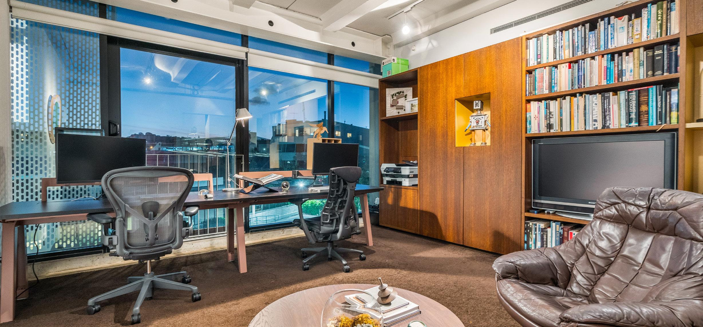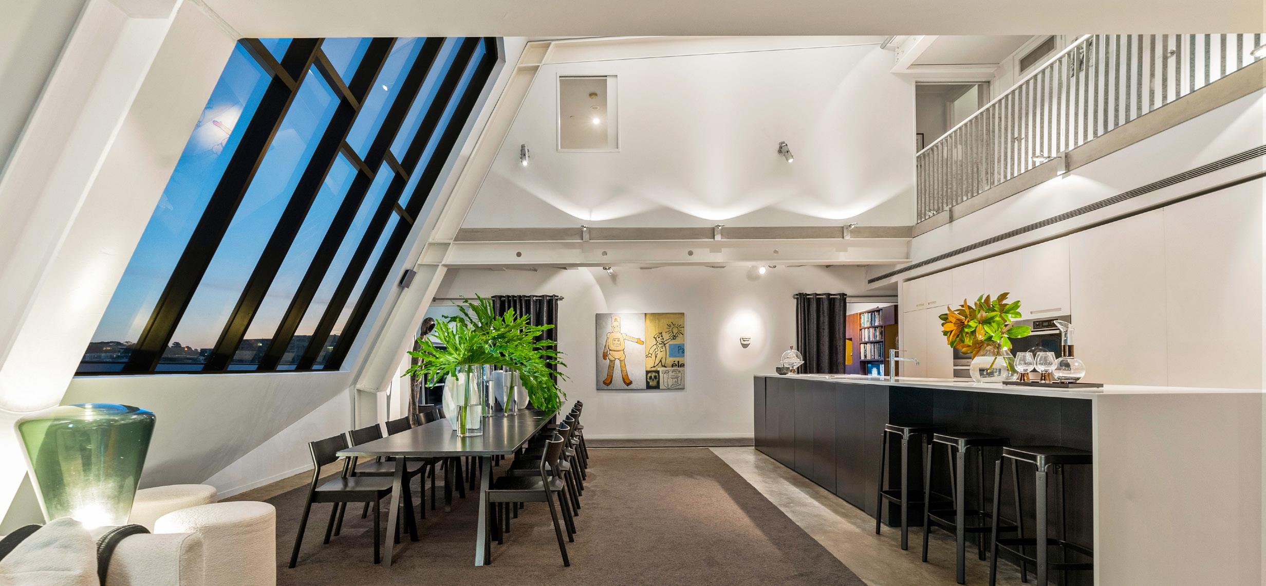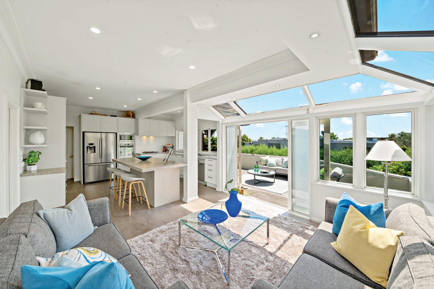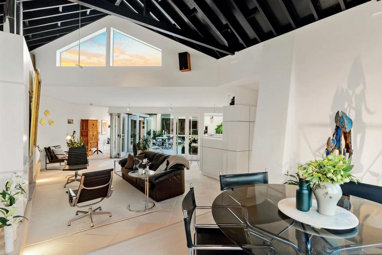 the magnificent open-plan space in polished-yet-intimate aesthetic. Cathedral-high windows, and a masterpiece of a skylight warmth.