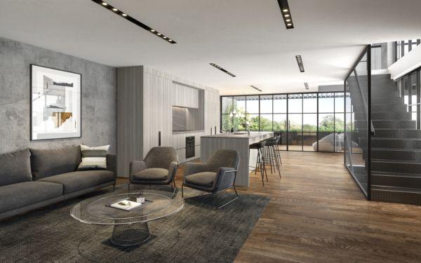 A selection of 3 and 4 bedroom lofts offering privacy yet maximising the use of outdoor space for entertaining with louvred canopies and balcony gardens. Carefully crafted industrial-style kitchen, full-height steel windows and open plan living.