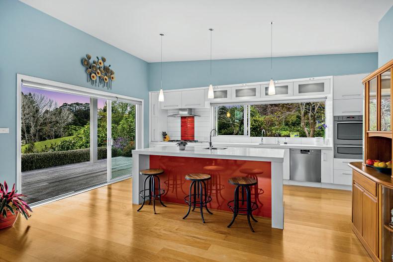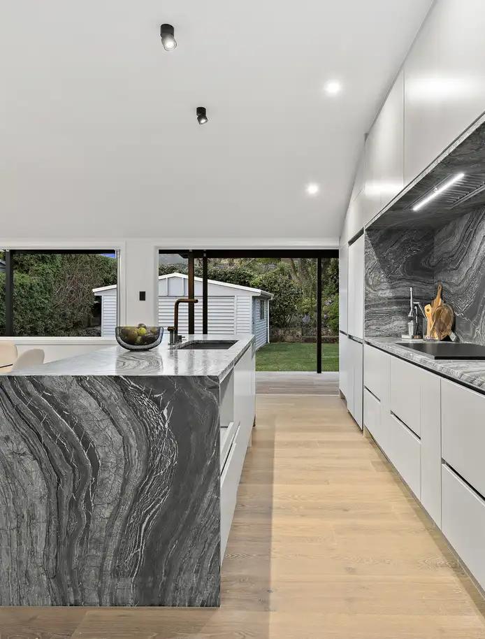 • Natural wide timber flooring, stone island benchtops and solid raw stainless steel details