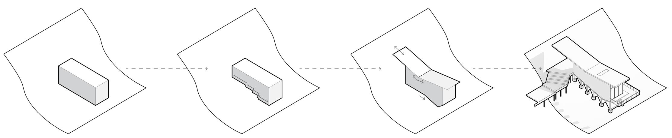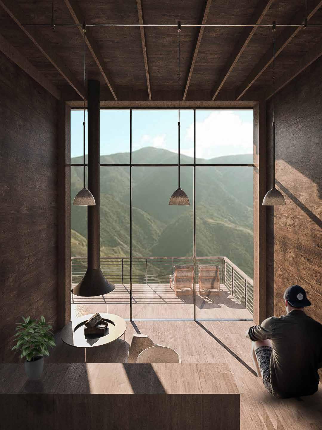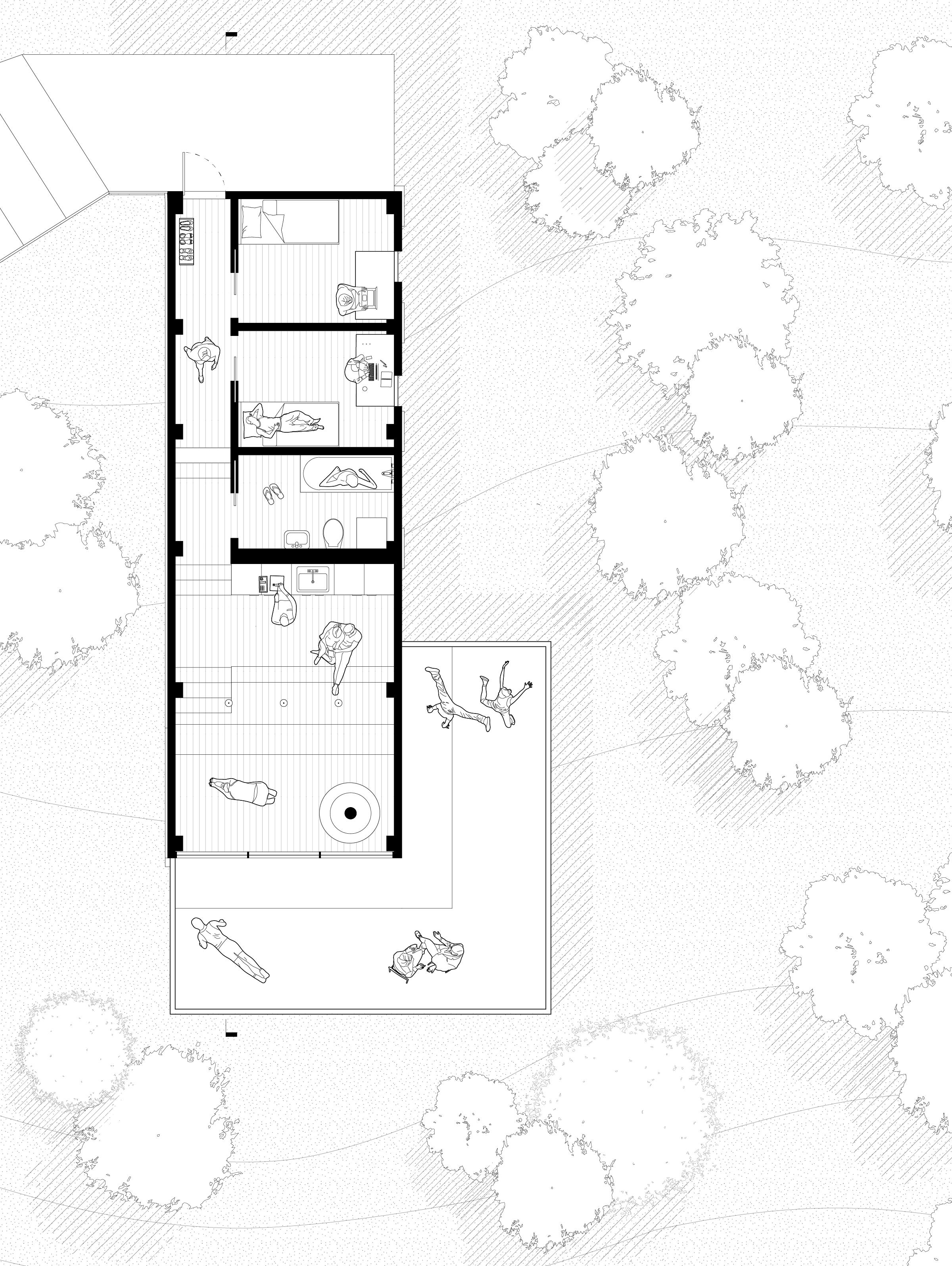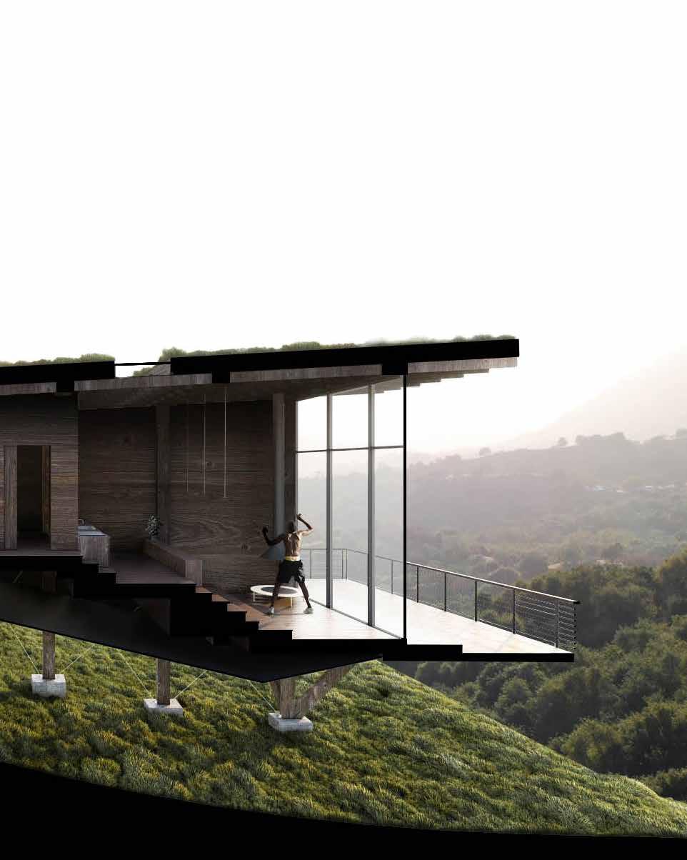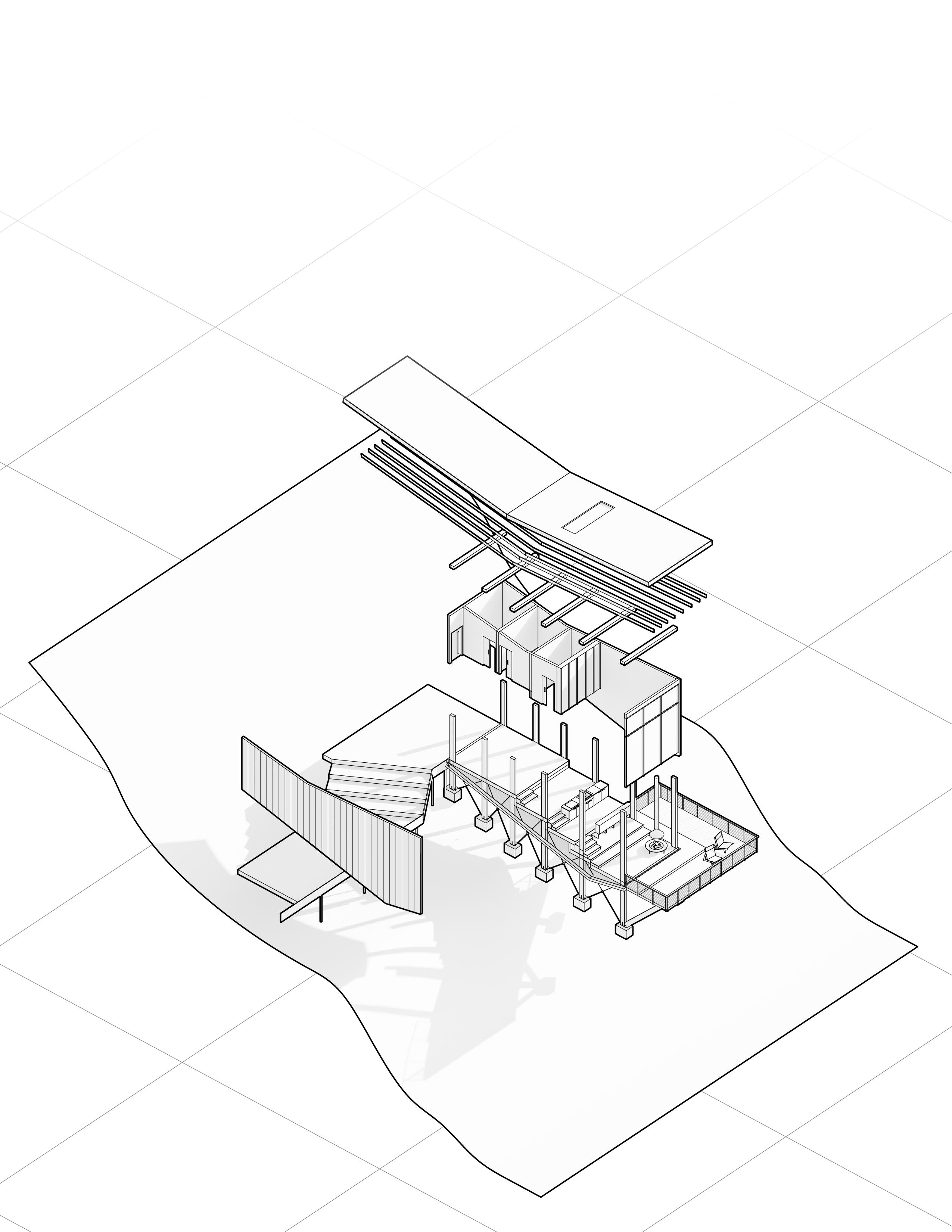 Located in the Blue and John Crow Mountains of South Jamaica, the Terrace House is a cabin that allows the user to separate themselves through a continuous space while maintaining separate functions. Thresholds within the small building are defined using levels and steps, as denoted by the change in elevation. Such thresholds are used as a means of delineating, programming, like sleeping areas, dining areas, and living areas.