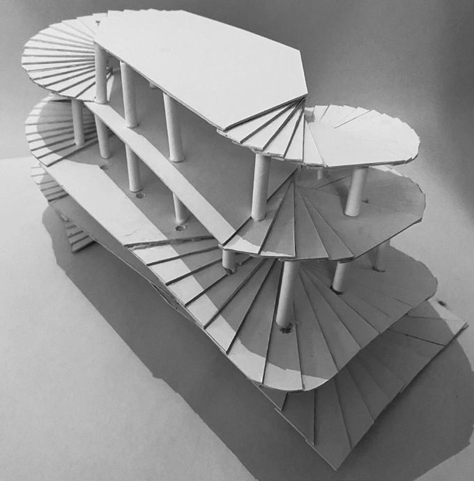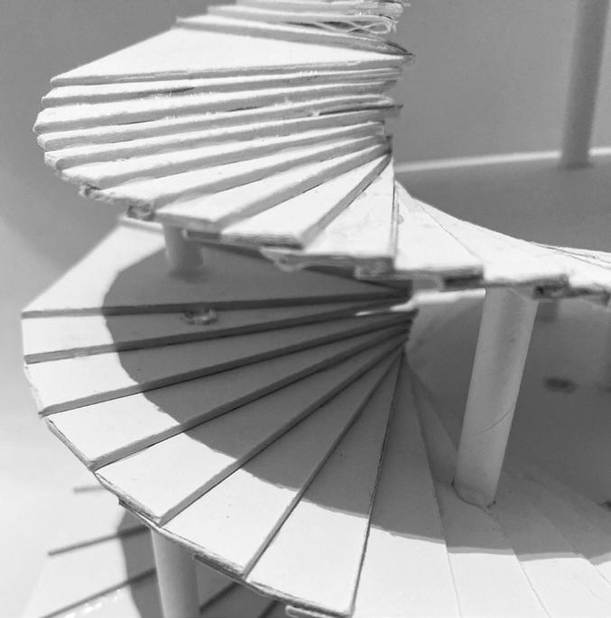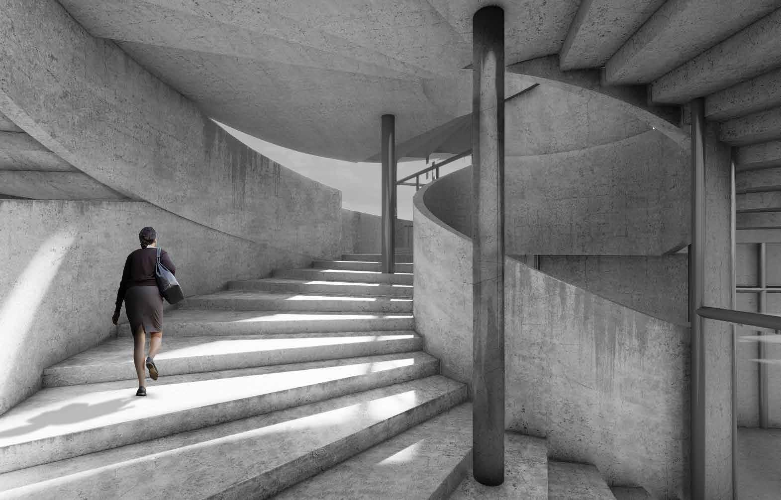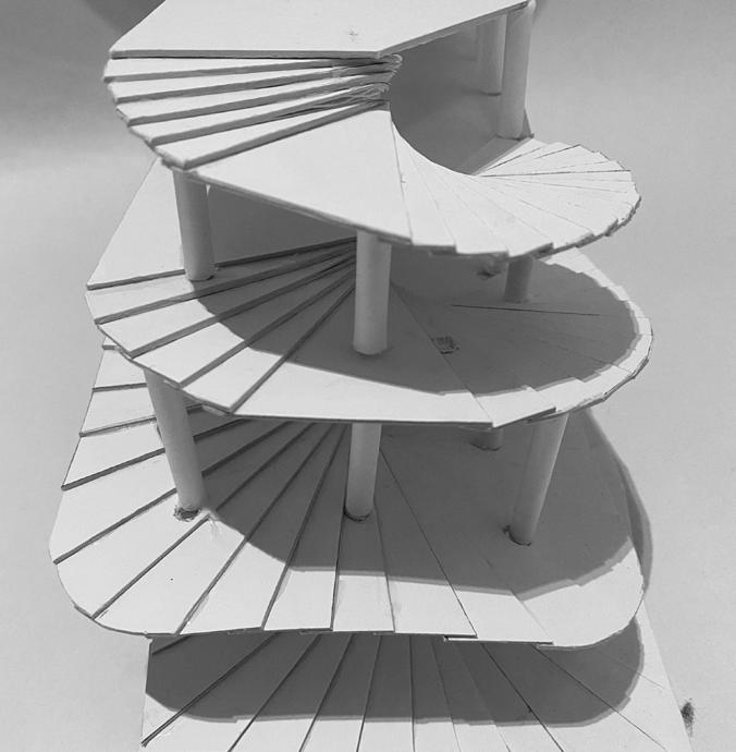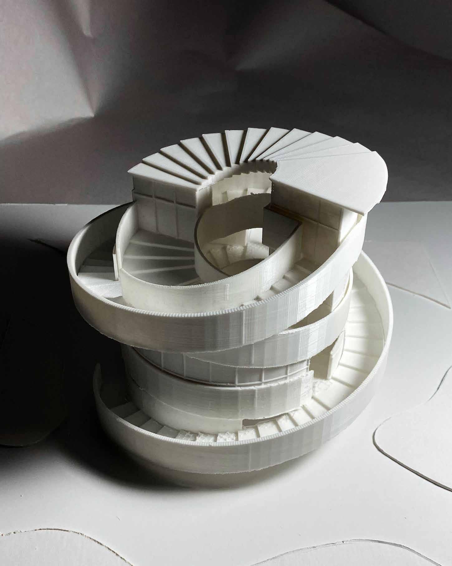 The student study space is made up of dual spiral staircases created from two different angles that rotate one step to the next. One staircase is created through a rotation angle of 12 degrees while the other is built through a rotation angle of 9 degrees. As a result, two forms of circulation are generated: a slow ascending staircase and a fast ascending one.