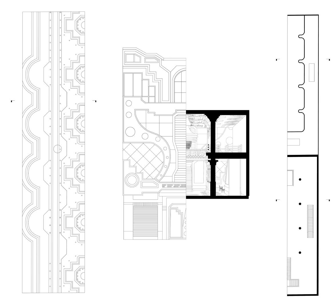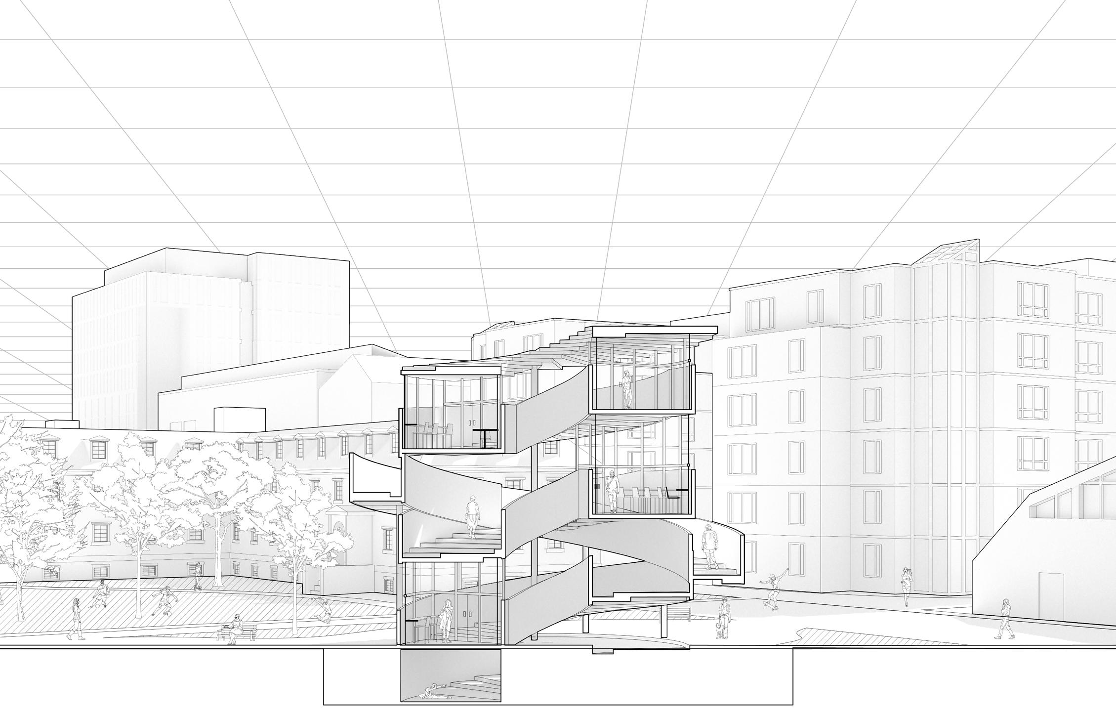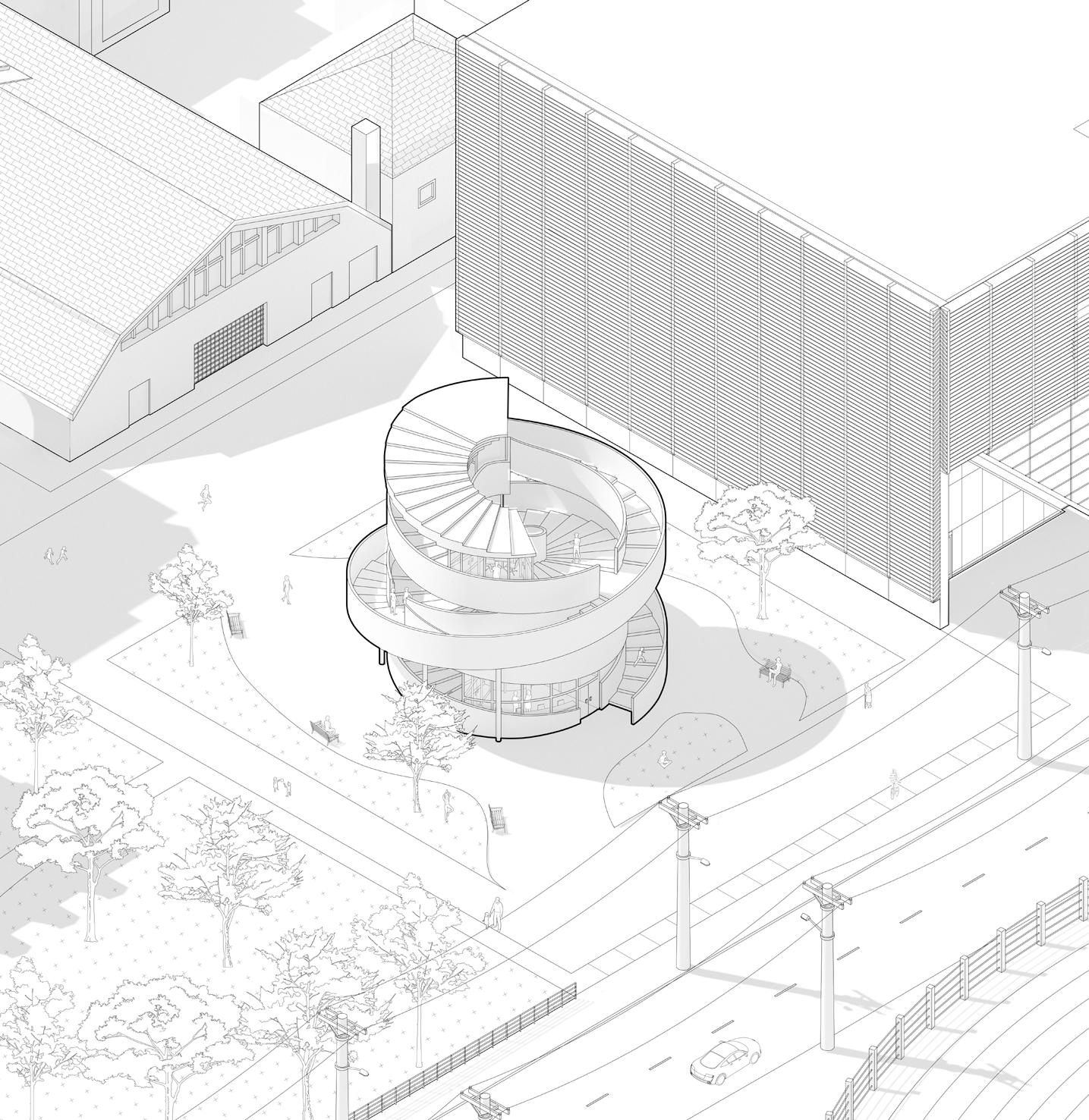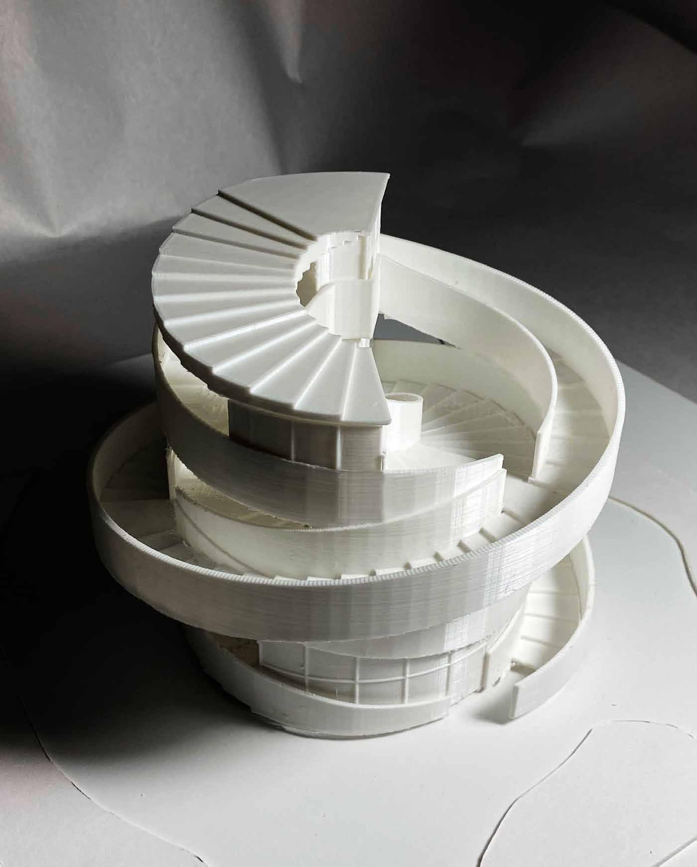 The student study space is made up of dual spiral staircases created from two different angles that rotate one step to the next. One staircase is created through a rotation angle of 12 degrees while the other is built through a rotation angle of 9 degrees. As a result, two forms of circulation are generated: a slow ascending staircase and a fast ascending one.