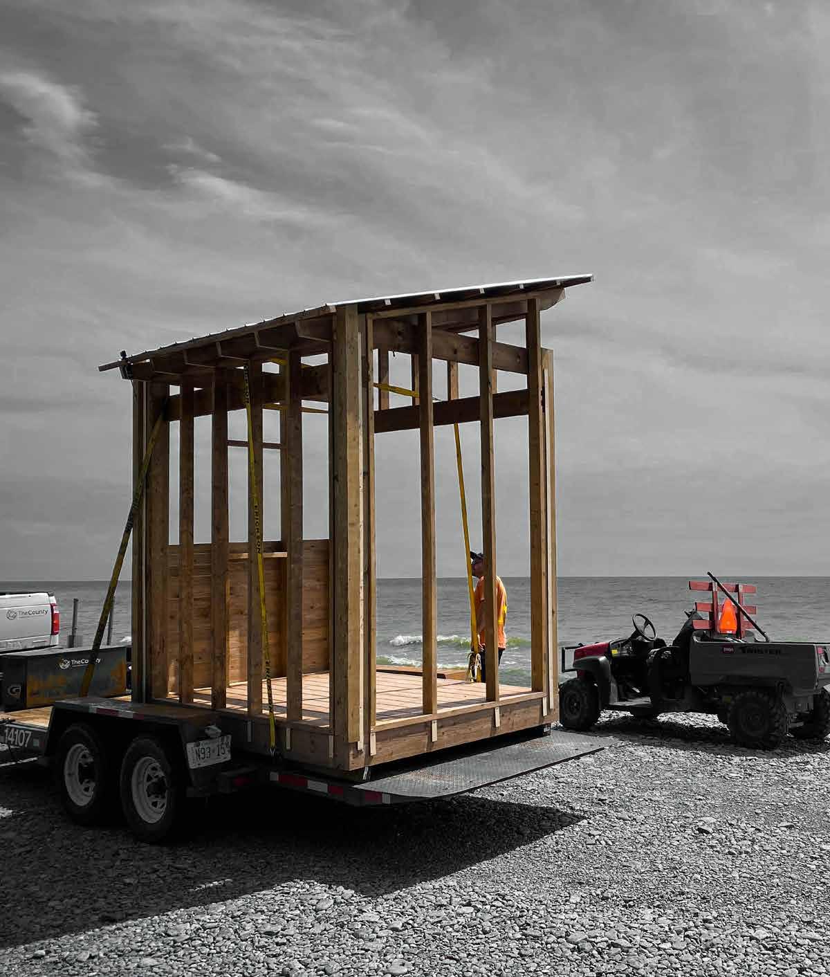 With transportability in mind, the gatehouse was built off-site and transported 19km across Prince Edward County to Wellington Rotary Beach. Transportability allows the gatehouse to be stored during the colder climates.